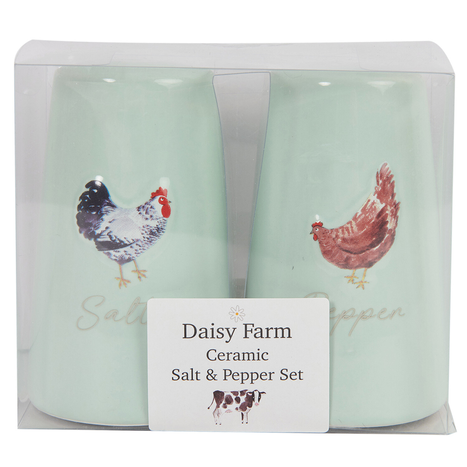 Add a subtle touch of whimsy to your dining table with the Daisy Farm Salt and Pepper Shaker Set. Including one salt and one pepper shaker, this set features a farmyard chicken design that gives it a quirky yet charming look. Match the set with the kitchen and tableware items from the daisy farm collection to complete the look.