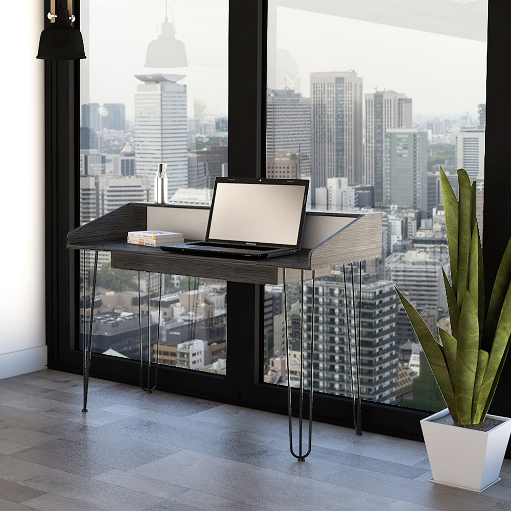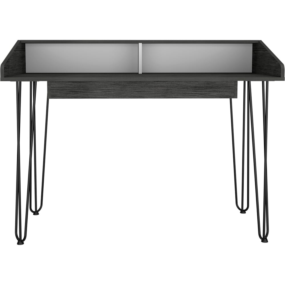 Add style to your productive space with this Dallas White and Carbon Grey Home Office Desk. This stylish and functional desk features a reinforced desk base for stability along with steel hairpin legs. It is made in an easy-to-clean, hardwearing white and carbon grey oak effect melamine finish and features a coordinating upstand.