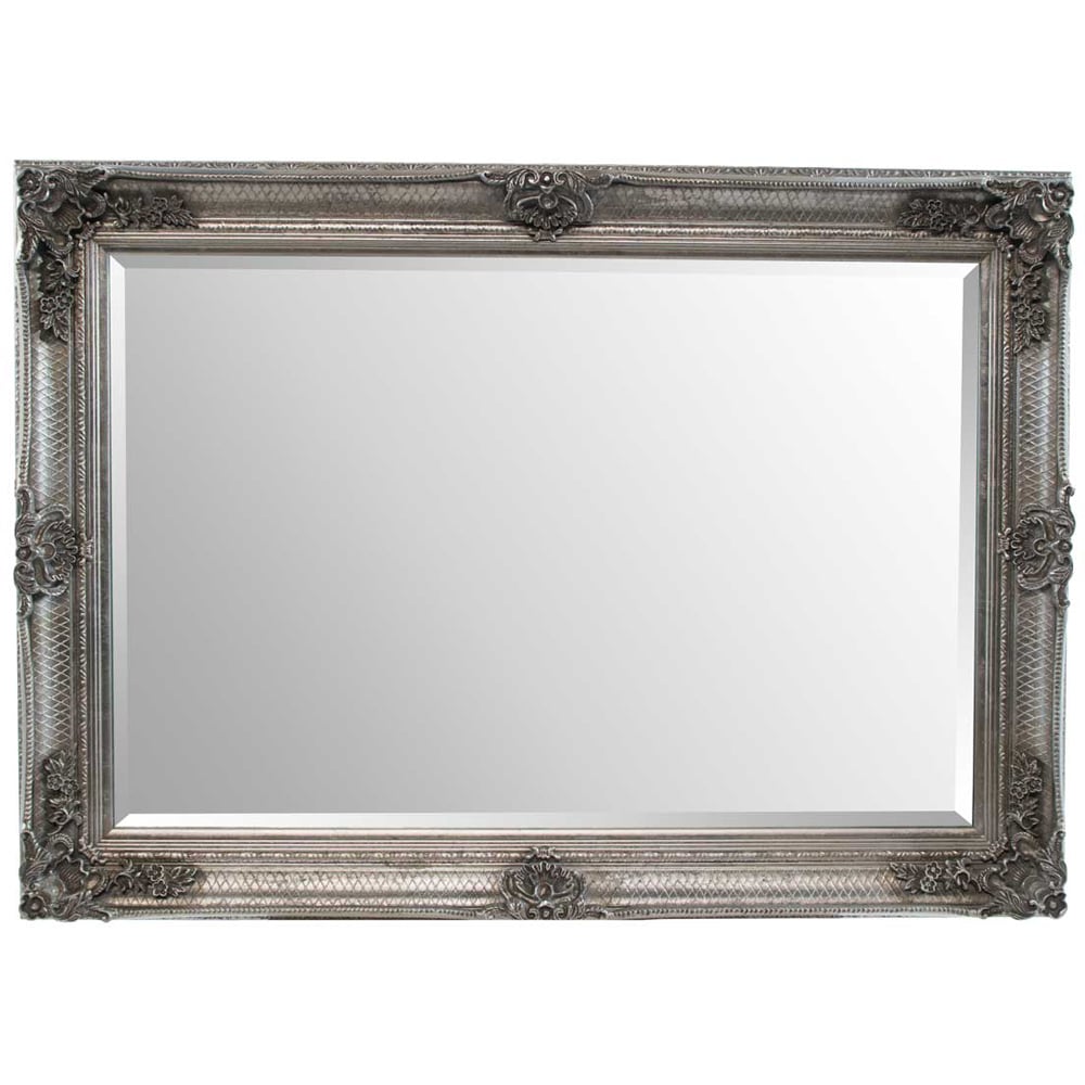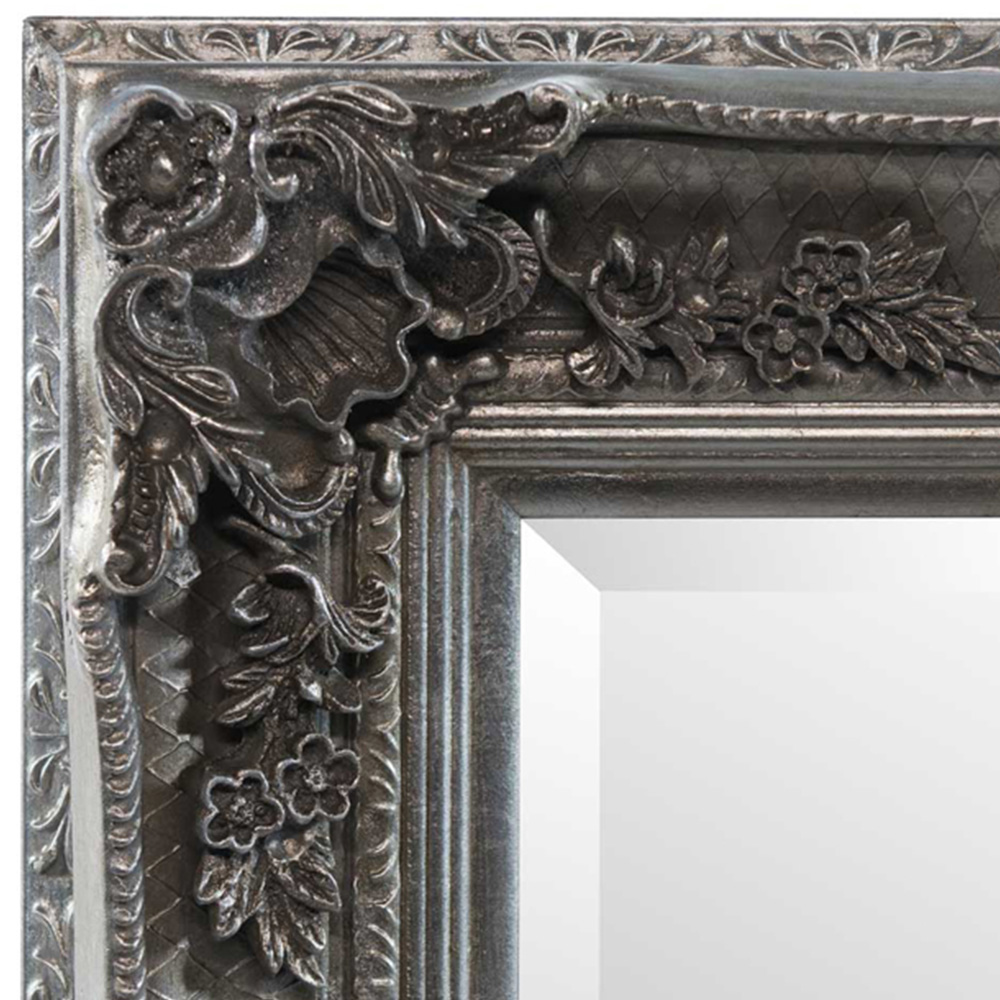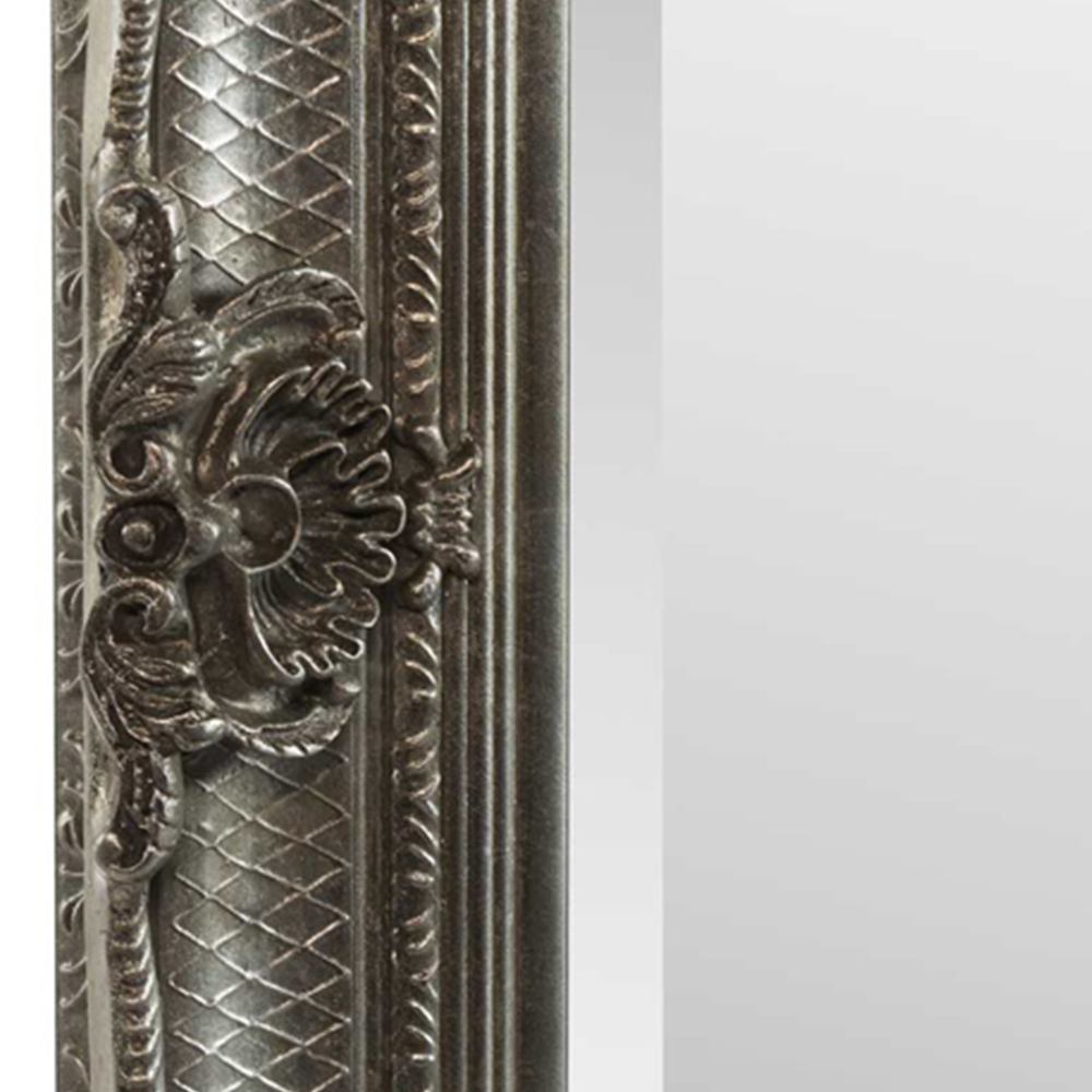 Enhance your interior with the Davenport Silver Ornate Flourish Large Wall Mirror 110 x 79cm. With ornate detailing in all four corners and sides adding class to any room. This mirror has a glass size of 91 x 61cm. Fully insured delivery.