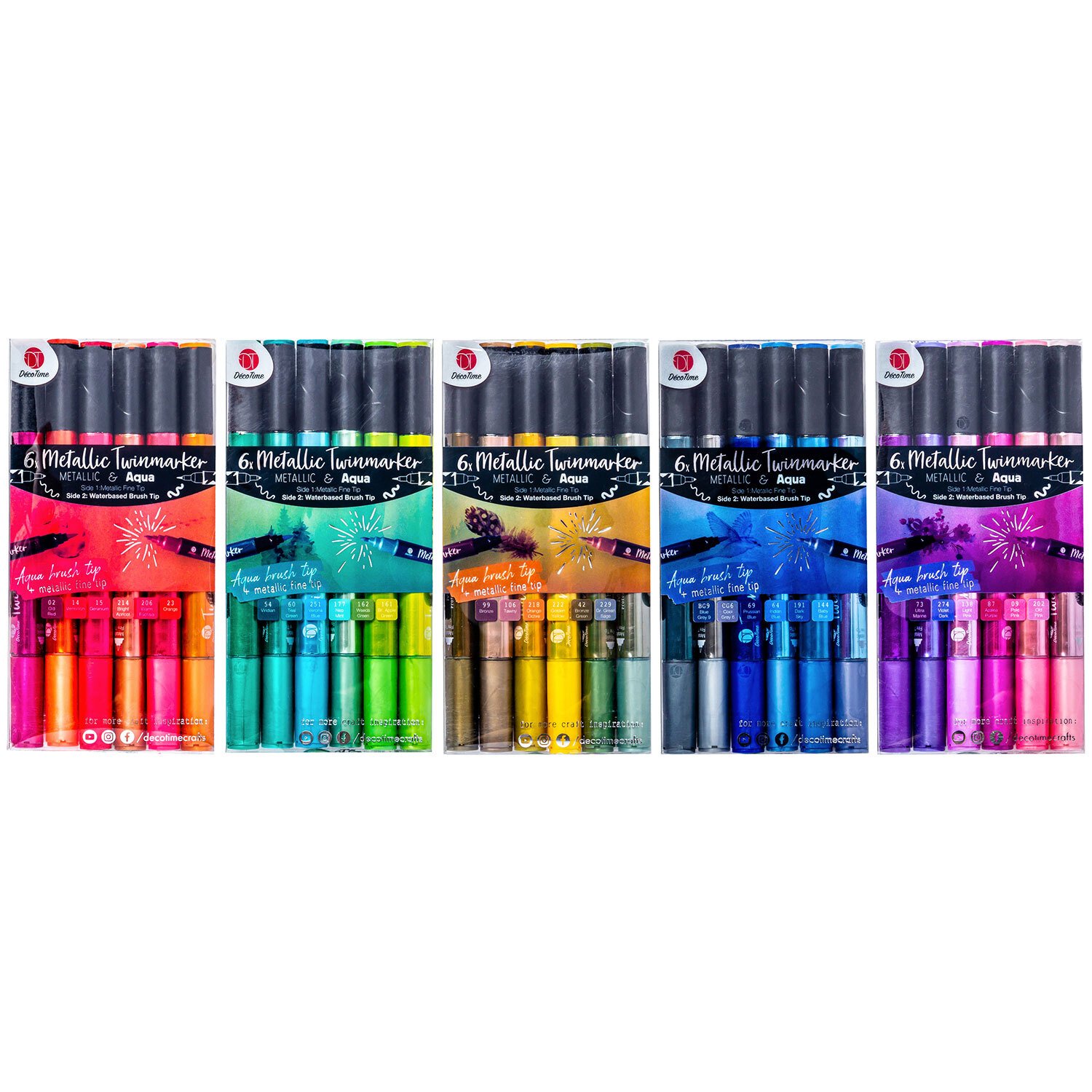 Unlock your creativity with the Deco Time Pack of 6 Assorted Metallic Twin Markers. Each marker features both a metallic fine tip and a water-based brush tip, making them perfect for all your artistic projects. Additionally, you can add water to achieve a beautiful watercolour effect. With a vibrant range of colours included in the set, these markers are ideal for artists, students, and hobbyists alike. Note: You will only receive one pack of pens.