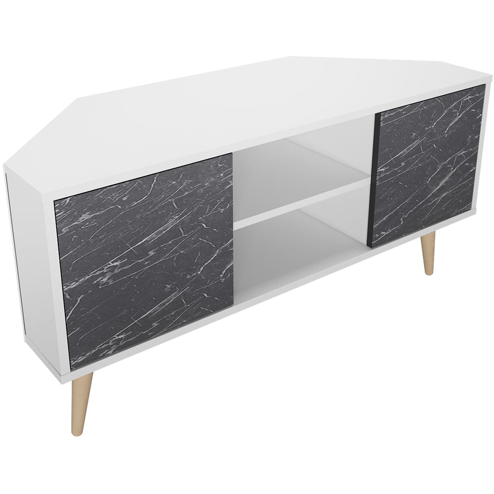 Lesson TV stand, with a width of 120cm, seamlessly blends practical functionality with a sleek and minimalist design, designed to accommodate TVs up to 55 inches. Specifically crafted to fit snugly into any corner, this TV stand brings a touch of timeless, traditional charm to your entertainment space. Its integrated cable management system ensures a neat and organized appearance, eliminating the hassle of dealing with messy wires. Constructed from durable 18mm thick melamine-coated particle board and reinforced with premium PVC edge banding tape, the stand guarantees both durability and quality. Featuring solid wood legs for enhanced strength, this eco-friendly product is made from TSE-certified materials and is delivered disassembled in its original package, allowing for easy customer assembly using common household tools.