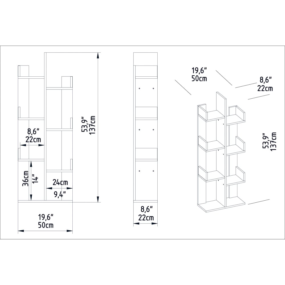 The Lui Tall Bookshelf has a unique tree-shape design, adding an elegant look to your home/office decor. The bookcase with four-tier half-backed eight shelves provides enormous space for storing or displaying your books and decorative items. Side shelves prevent items from falling while back board and the base board ensure a better load bearing and stability. It can also be used as a storage shelf; plant stand or flower rack. Contemporary design allows it to easily complement your home or office decor. The bookshelf is made of 18mm thick melamine veneered particle board and banded with PVC edge band. It is manufactured using health-friendly materials. The product will be delivered to the customer in the original package as disassembled. It is designed to be assembled by the customer using a power drill and screwdriver. Assembly instruction and installation hardware are included in the package. For fast and error-free installation, product parts are numbered with stickers following the assembly guide. Height: 137cm.