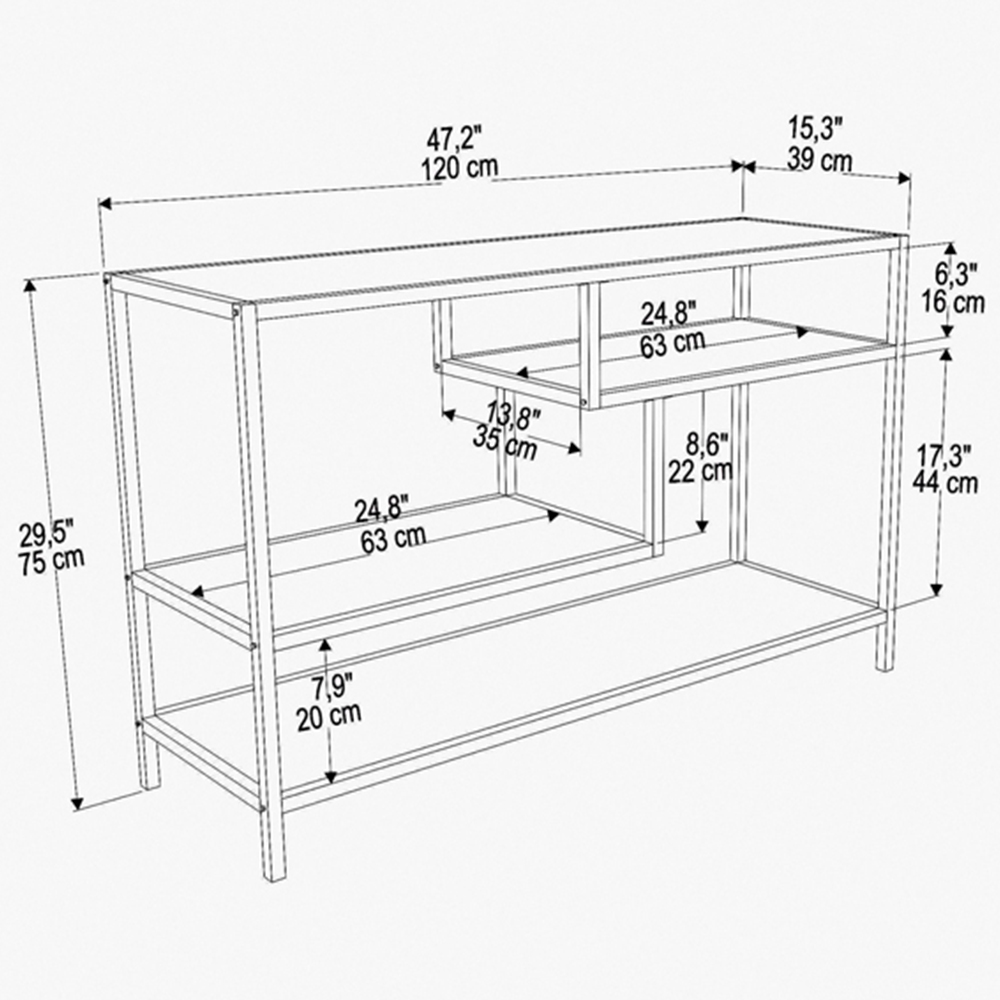 Transform your space with this Robins 120cm wide TV stand and media console for TVs up to 55 inch. It is one of the perfect combinations of industrial metal and walnut colour 18mm thick quality manufactured wood. It is banded with first-class 8mm PVC edge banding tape. Overall, the media stand is manufactured using eco-friendly and health-friendly TSE-certified materials. Elegance and industrial look make you fell in love with this TV stand. X-frame will add a sophisticated look, at the same time, you will feel a rustic environment along with industrial touch. Open shelves provide an additional storage compartment for books, magazines, and other decorative accessories. A durable solid structure will give you the opportunity to use this TV stand for a long time. It can easily be assembled and disassembled so you will not have a problem while moving to your new house. The product will be delivered to the customer in the original package as disassembled. It is designed to be assembled by the customer easily using simple household tools like a power drill or wrench. Assembly instruction and installation hardware are included in the package. Height: 75cm, Width: 120cm and Depth: 39cm. Weight: 24kg. Features: Industrial metal frame. Sturdy and durable. Health friendly material. Product details: Condition - New. Shelf material – 18 mm manufactured wood. Frame material - Metal. Country of origin - Turkey. Assembly required - Yes. Additional tools required – Screwdriver, socket wrench. Dimension of overall product weight - 24kg. Top shelf – H16 x W63 x D35cm. Middle shelf – H22 x W63 x D35cm. Bottom shelf – H20 x W120 x D35cm. Weight capacity – 50kg. Package dimensions: Length: 125cm, Width: 48cm, Height: 18cm Weight: 25kg. Package includes Robbins 120cm TV Stand. Assembly instructional: Installation hardware.