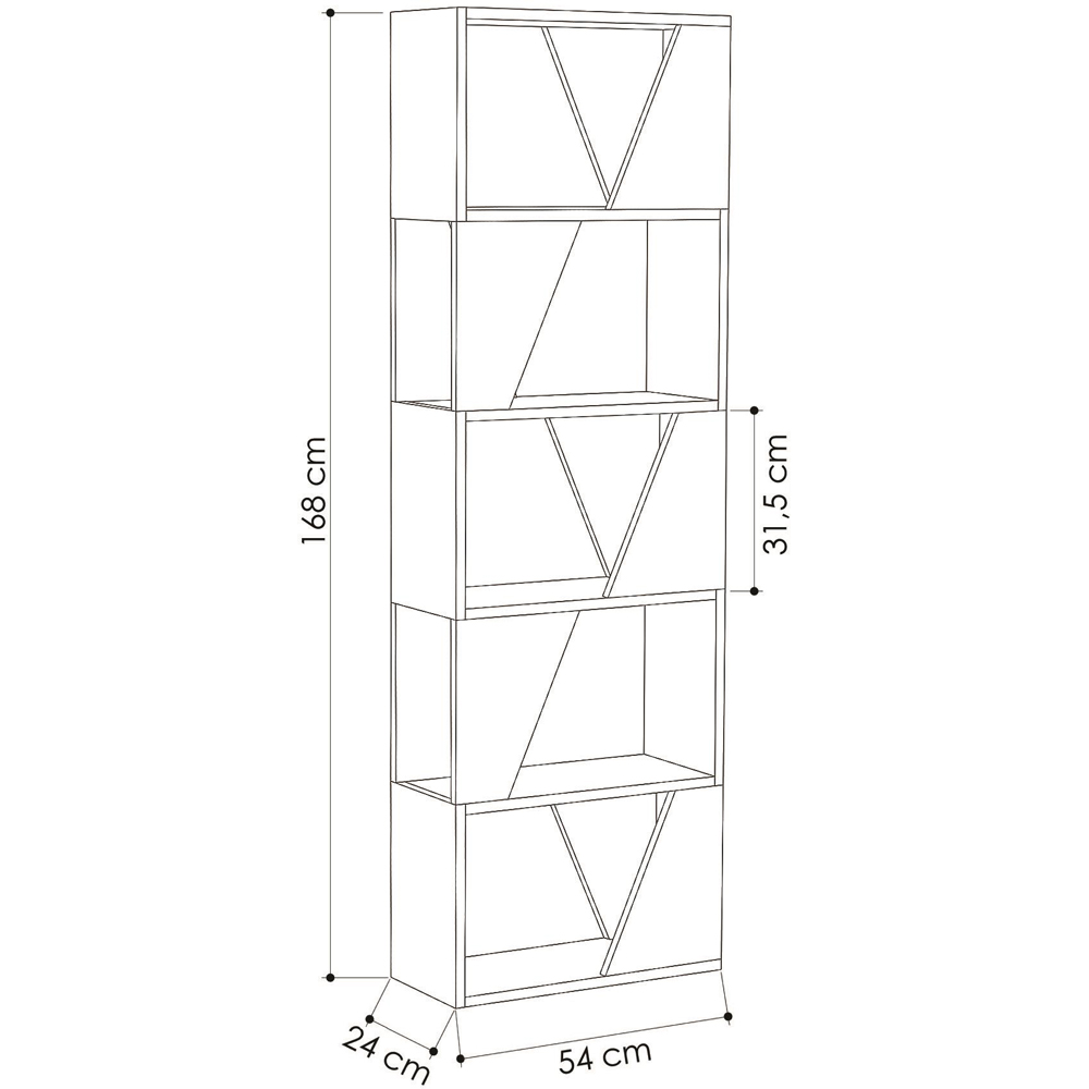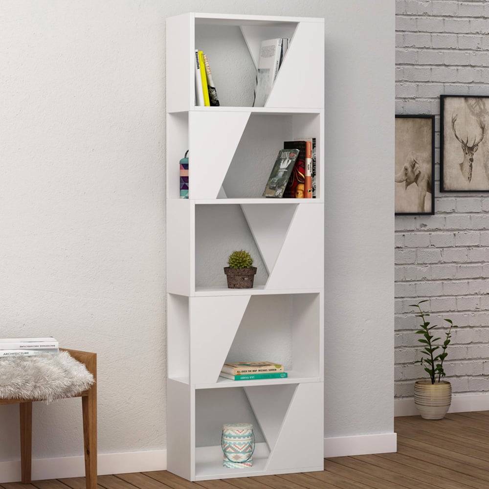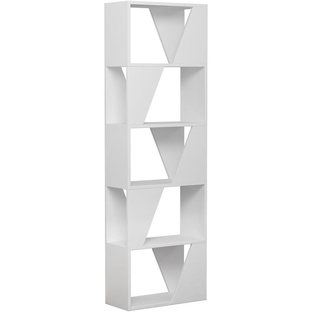 Elevate the look of your space with the Decortie Frame 5 Shelf White Bookcase. This unique diagonal freestanding bookcase features a compact design with ample storage for your book collection and decor. It comes with five spacious shelves and customizable colour options, making it perfect for any room in your home. Add it to your space today to transform your home decor. It's suitable for storing various items such as books, photo frames, and decor and can be used not only as a bookshelf but also in an office or even in a kitchen. Dimensions: H54 x W168 x L24cm.