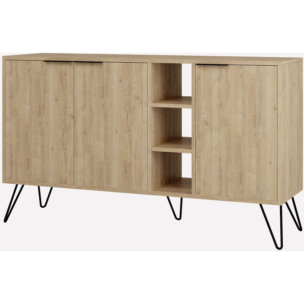 Elevate your home with the Decortie Clara Oak Console Sideboard, a perfect blend of functionality and style. This unique cabinet offers generous storage space, with an interior shelf in each compartment to help keep your items organised. Designed with durable engineered wood and a protective melamine finish, it ensures long-lasting use and easy maintenance. The sturdy hairpin metal legs provide stability while adding a contemporary touch to your decor. Measuring 142 x 36 x 83 cm, this console unit fits effortlessly into various spaces, making it a stylish and practical addition to your home.