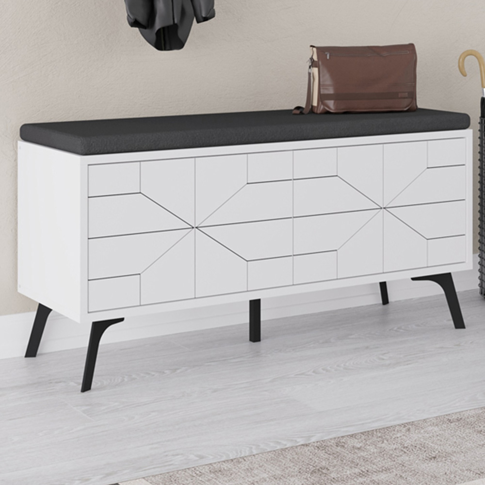 Elevate your entryway with a modern hallway shoe bench, blending practicality with contemporary style. Crafted from durable 18mm engineered wood and supported by sturdy metal legs, this entryway bench with shoe storage brings both comfort and organisation to your home. The spacious four-door cabinet keeps shoes neatly out of sight, while the cushioned fabric seat ensures you can sit comfortably as you come and go. Designed to fit seamlessly in small hallways or larger foyers, this shoe storage bench with a cushioned seat suits any modern home, creating an inviting and clutter-free entrance.