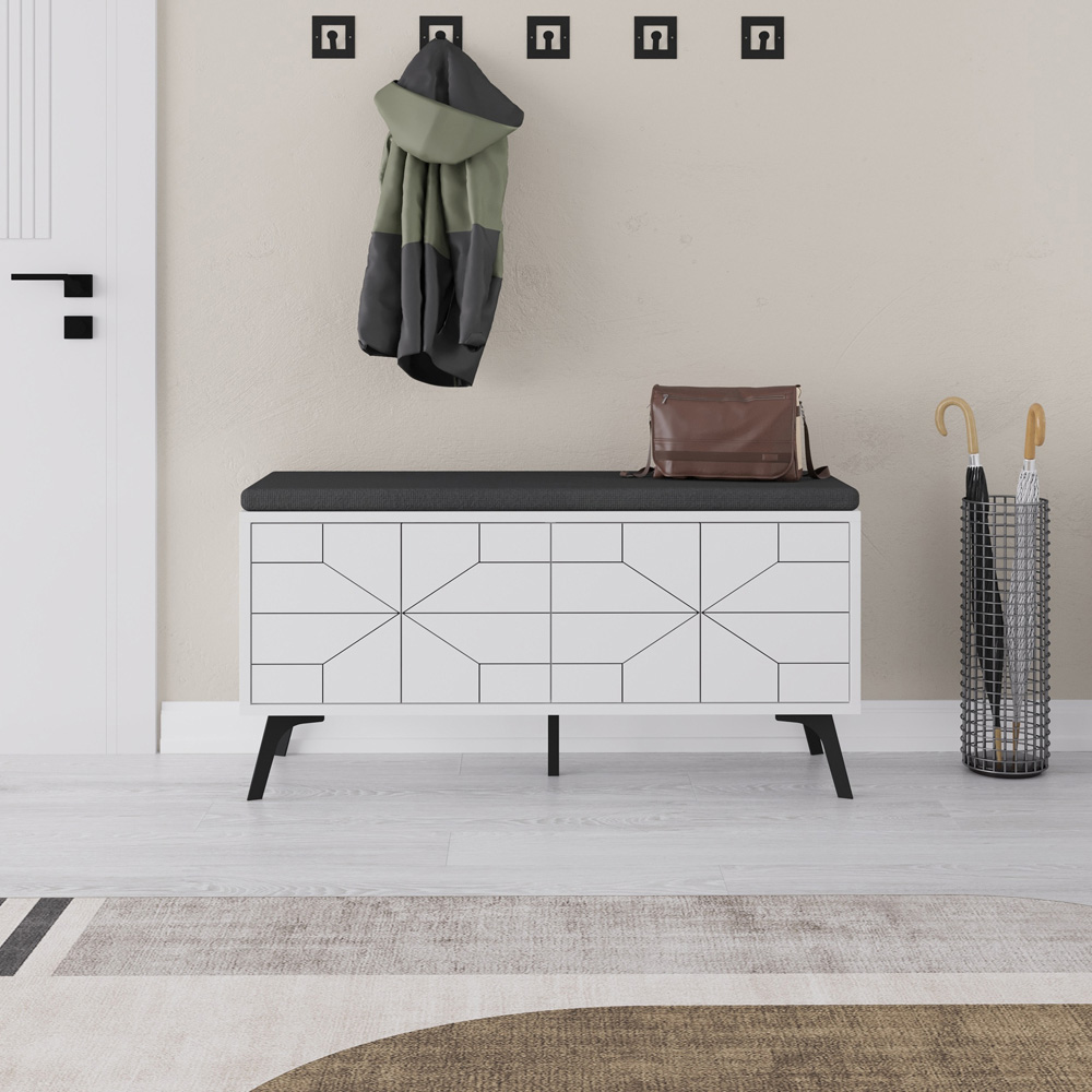 - Cushioned fabric bench provides comfortable seating while changing shoes