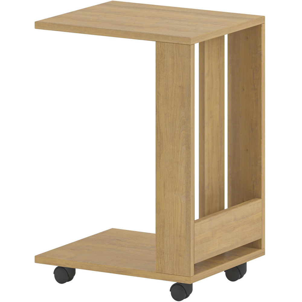 Transform your space in style with the Decortie Edi Oak C Sofa Side Table with Storage. It features an open compartment that doubles as a magazine rack and four wheels for easy mobility. It's the perfect size to complement your sofa or armchair and features an open compartment that doubles as a magazine rack. With four wheels, it's easy to move around and use. You can use it as a standalone piece or side table for a touch of sophistication. Supported by a thorough 2-year warranty, it ensures quality and reliability. Dimensions: H60 x W37 x D45cm.