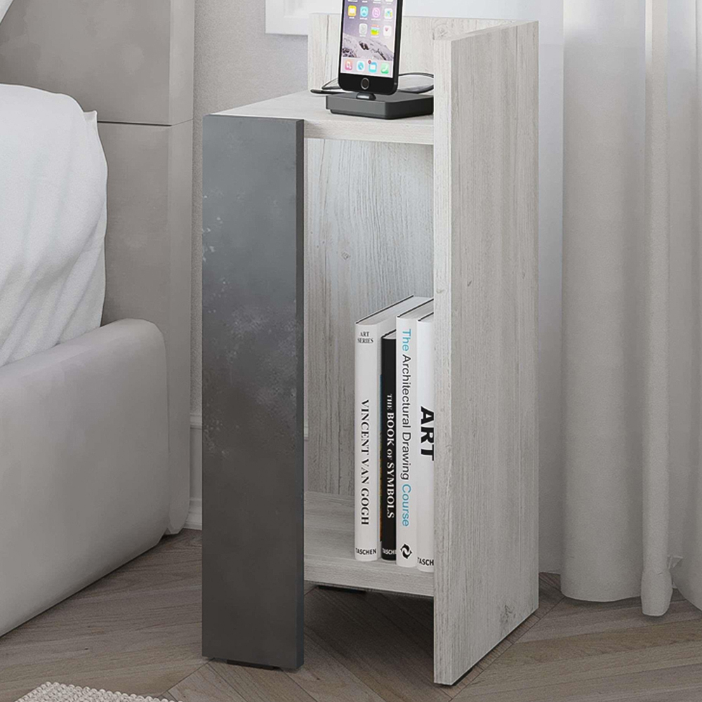 Enhance your bedroom decor with the Decortie Elos 2 Shelf Ancient White and Retro Grey Bedside Table. This narrow nightstand features a right-side module in a chic combination of ancient white and retro grey. Crafted from high-quality engineered wood with a protective melamine finish, this table is durable and easy to maintain. With two spacious shelves, it is ideal for storing essentials and doubles as a side table, end table, or display unit.