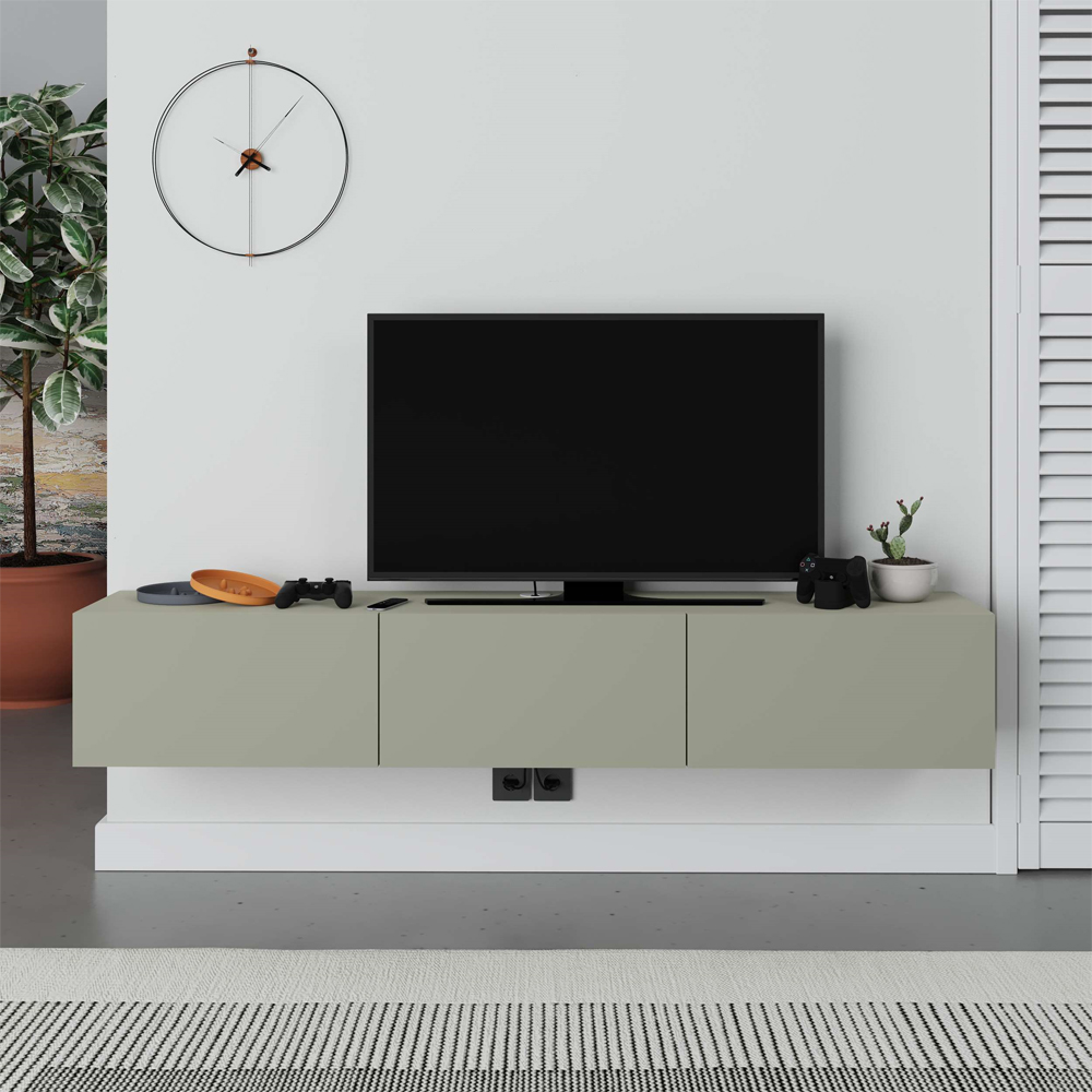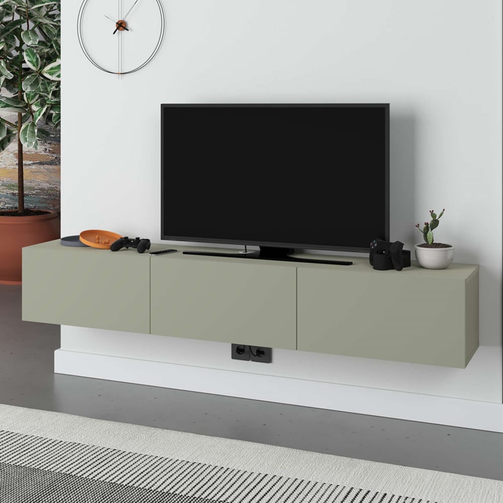 Elevate your living space with the Decortie Francy Ash Green TV Stand with a Storage Cabinet. This elegant and modern wall-mounted TV unit is designed to be the centrepiece of any room. Crafted from high-quality 18mm engineered wood, it combines style and functionality, making it perfect for living rooms, offices, or any area where aesthetics meet practicality. With a width of 180cm, it's suitable for TVs up to 55 inches and features three cabinet doors for organised storage of your media essentials. The low-maintenance design means you can simply wipe it clean with a damp cloth, and it’s made from eco-friendly materials. It's time to add a modern touch to your home with this stylish piece!