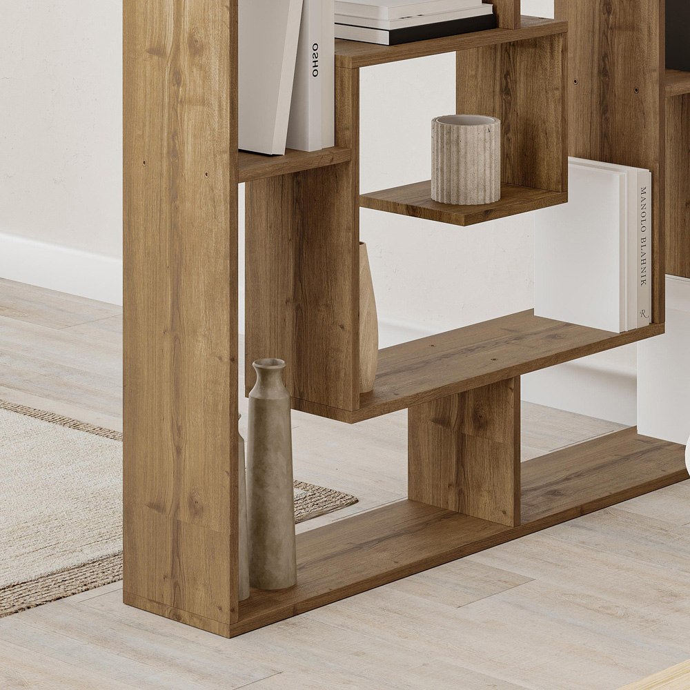 Add a touch of elegance and style to your living room, bedroom, or office with the Labirent 5 Shelf Dark Oak Effect Maze Bookcase. This modern and contemporary bookcase will impress any guest and is perfect for both home and office use. Mix and match to create a personalized look that will breathe new life into your space. Its elegant maze design will be a great feature in any room. The bookcase also has a reversible feature, so you can use it as a room divider. Supported by a thorough two year warranty, it ensures quality and reliability. Dimensions: H129 x W125 x L22cm.