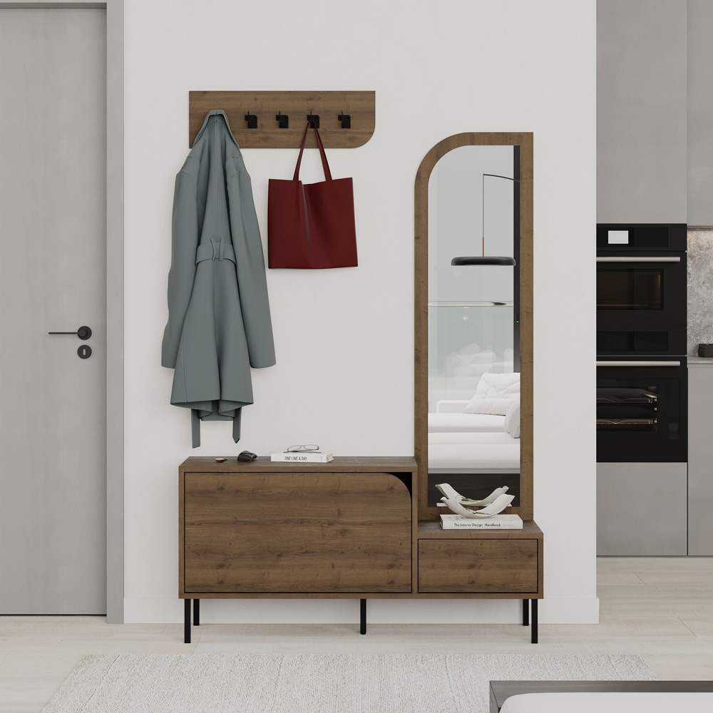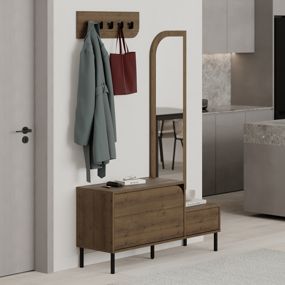 - Integrates coat stand, full-length mirror and shoe cabinet