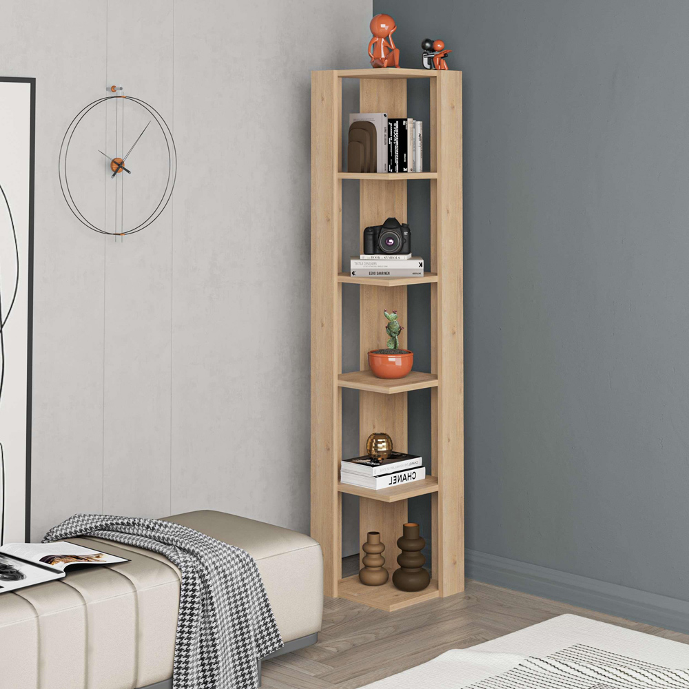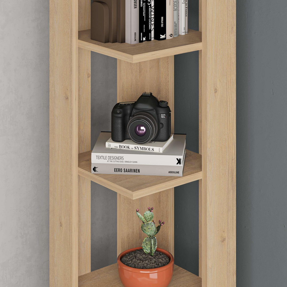 Get a stylish solution to storage with the Decortie Nati 5 Shelf Oak Modern Corner Bookcase. This sleek bookcase is designed to fit perfectly into any corner, making it ideal for compact areas. It has five tiers, providing ample space for storing and displaying books, plants, and decorative items. The bookcase features a modern design with an oak colour, blending effortlessly with any decor style.