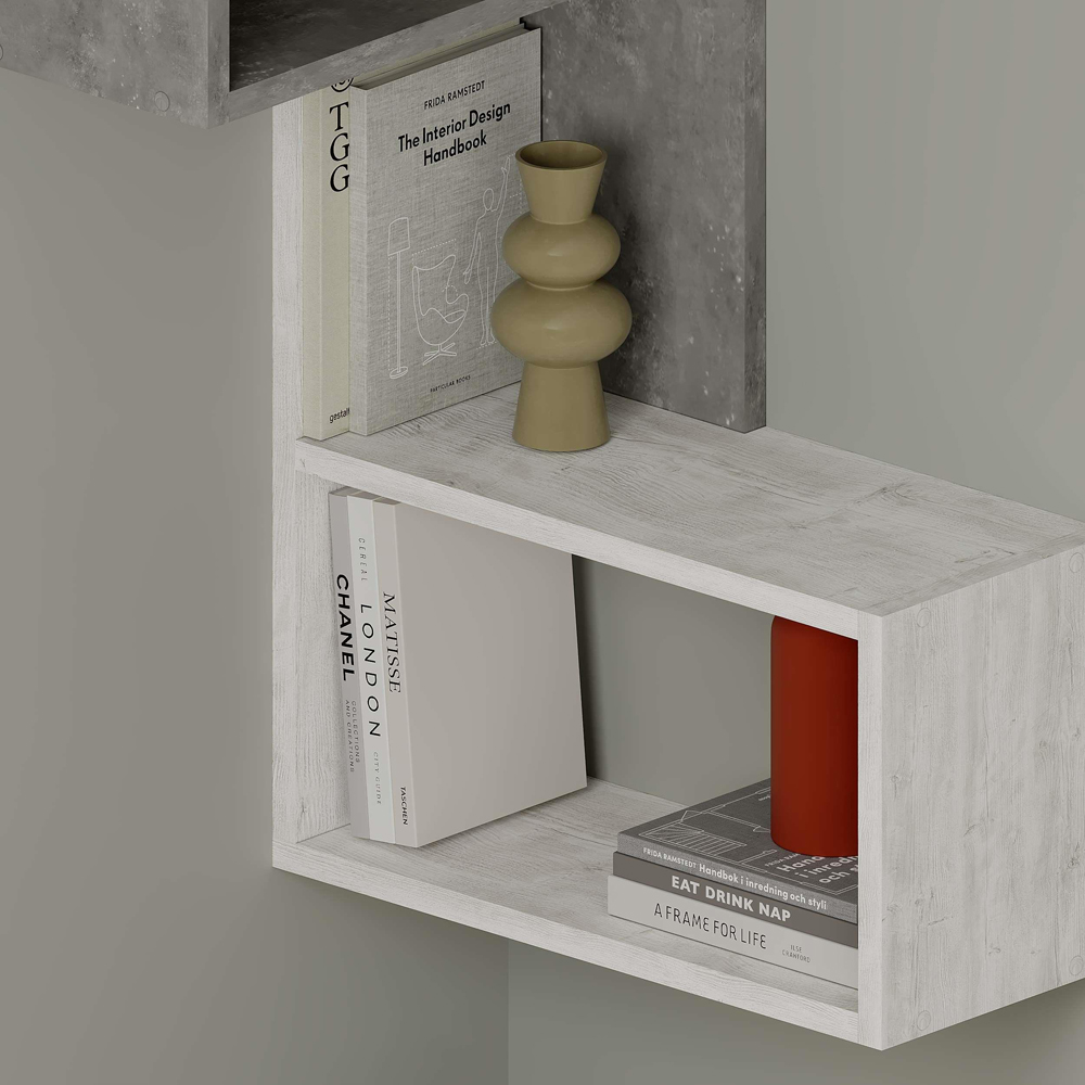 Add character to your walls with the Decortie Part Single Shelf 2 Cube Retro Grey and Ancient White Corner Bookcase. This stylish wall-mounted shelf is designed to fit perfectly into any corner, maximizing space while maintaining a chic look. It measures 82 x 47 x 47cm and features three tiers, providing an ideal setup for displaying books, plants, and decorative items. The bookcase is made from high-quality engineered wood with a protective melamine finish, seamlessly matching any decor. Its modern and sleek design makes it a versatile addition to any room, enhancing functionality and aesthetic appeal.