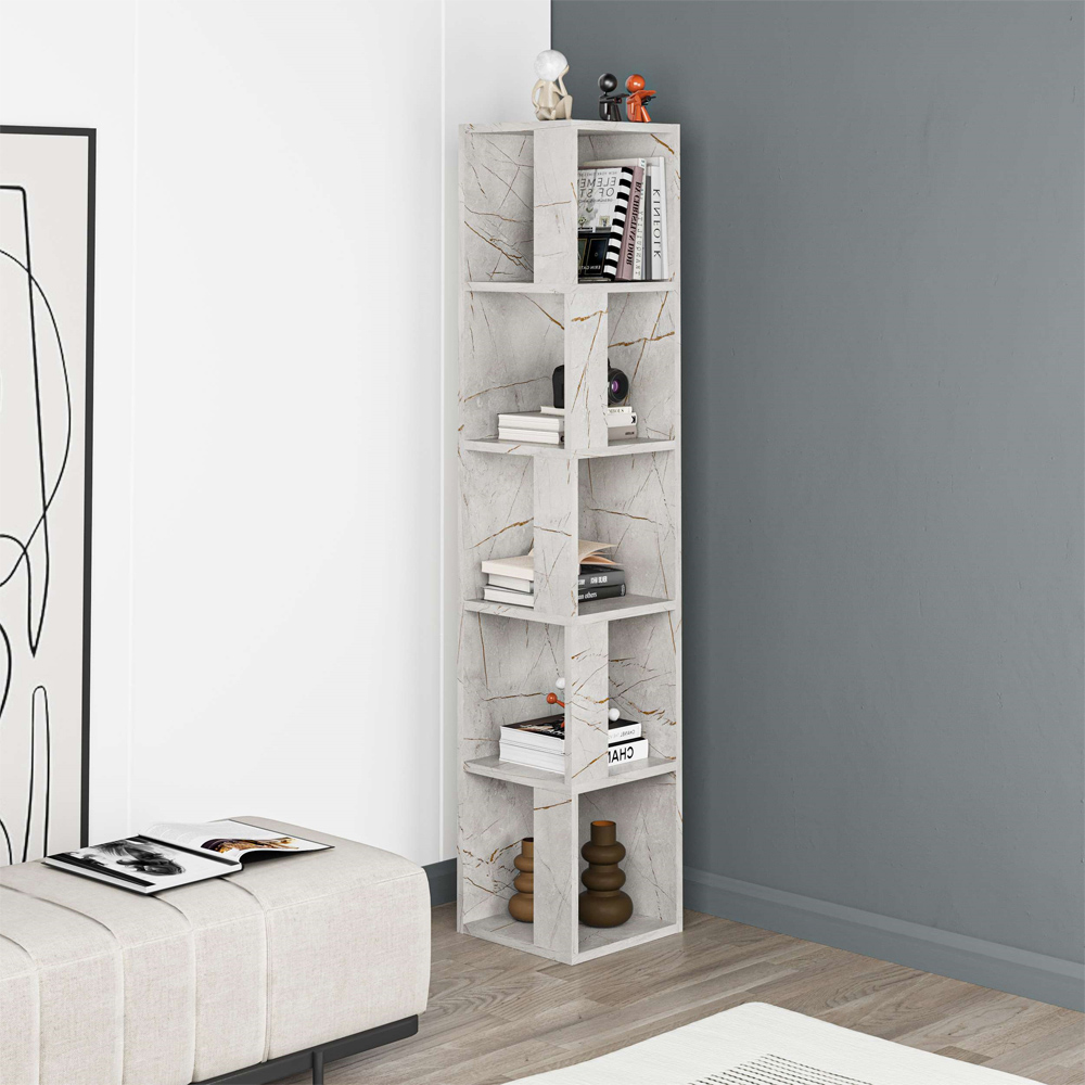 Elevate your interior decor with the Decortie Piano Modern Corner Bookcase, blending elegance and utility in a compact, space-saving design. This bookcase stands at 158.9 cm tall and features five open tiers, perfect for showcasing books, plants, or cherished decor pieces. Its striking black marble effect adds a touch of sophistication, making it an ideal piece for modern homes and offices. Designed with both style and practicality in mind, this corner bookcase maximises space without overwhelming it, measuring 32 x 32 x 158.9 cm. Constructed from premium engineered wood with a protective melamine coating, it is built to withstand daily use while being easy to maintain—just wipe with a damp cloth for a fresh look. This freestanding bookcase integrates seamlessly into any decor style, adding both elegance and storage.