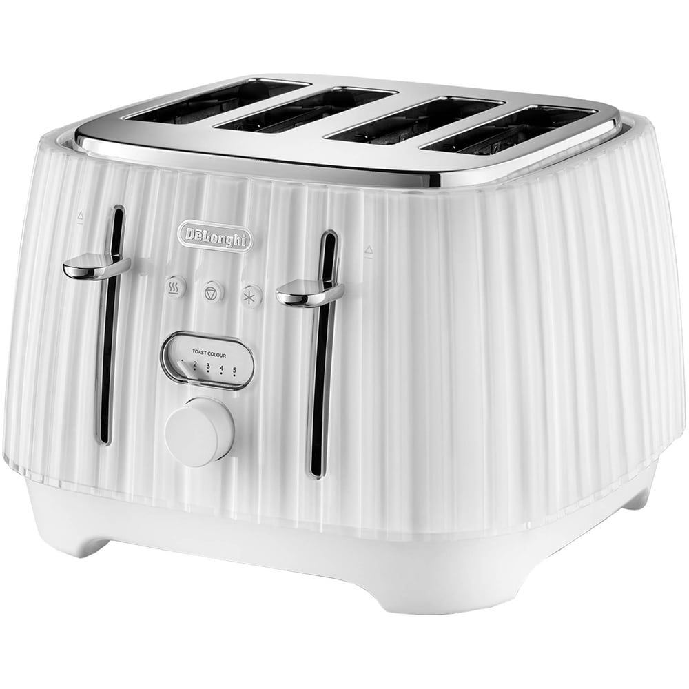 Start your day effortlessly with the DL3004 De’Longhi 4-slice toaster in white, blending practicality with the refined elegance of Ballerina style. Perfect for waffles, tea cakes, or a cosy breakfast to share, it exudes grace and sophistication with its sleek design and harmonious details. The variable browning control lets everyone enjoy toast exactly how they like it, while the high lift function makes retrieving smaller items, like crumpets, simple and safe. The defrost setting takes bread straight from the freezer to your plate, which is ideal for quickly preparing baps for a summer BBQ. With wide slots, six browning levels, independent toasting slots for added versatility, and a removable crumb tray for easy cleanup, this toaster combines convenience, refined design, and a touch of artistry to make every breakfast a treat.