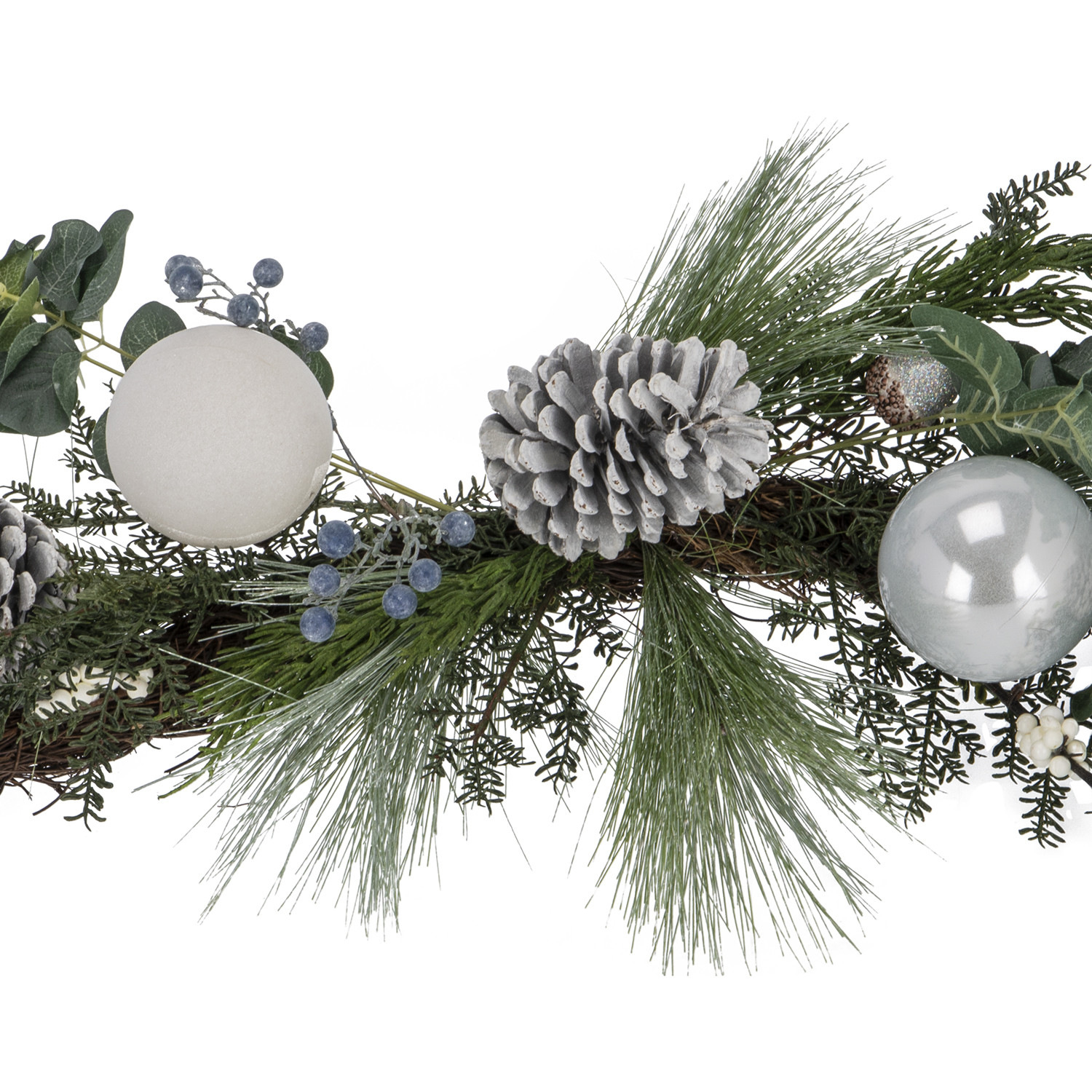 This Deluxe Frosted Bauble Pinecone Garland is a luxurious garland perfect for weaving through wreaths or laying across a mantlepiece. This garland is made up of realistic looking sprigs of pine and holly leaves, along with white pinecones, shining baubles, and clusters of blueberries.