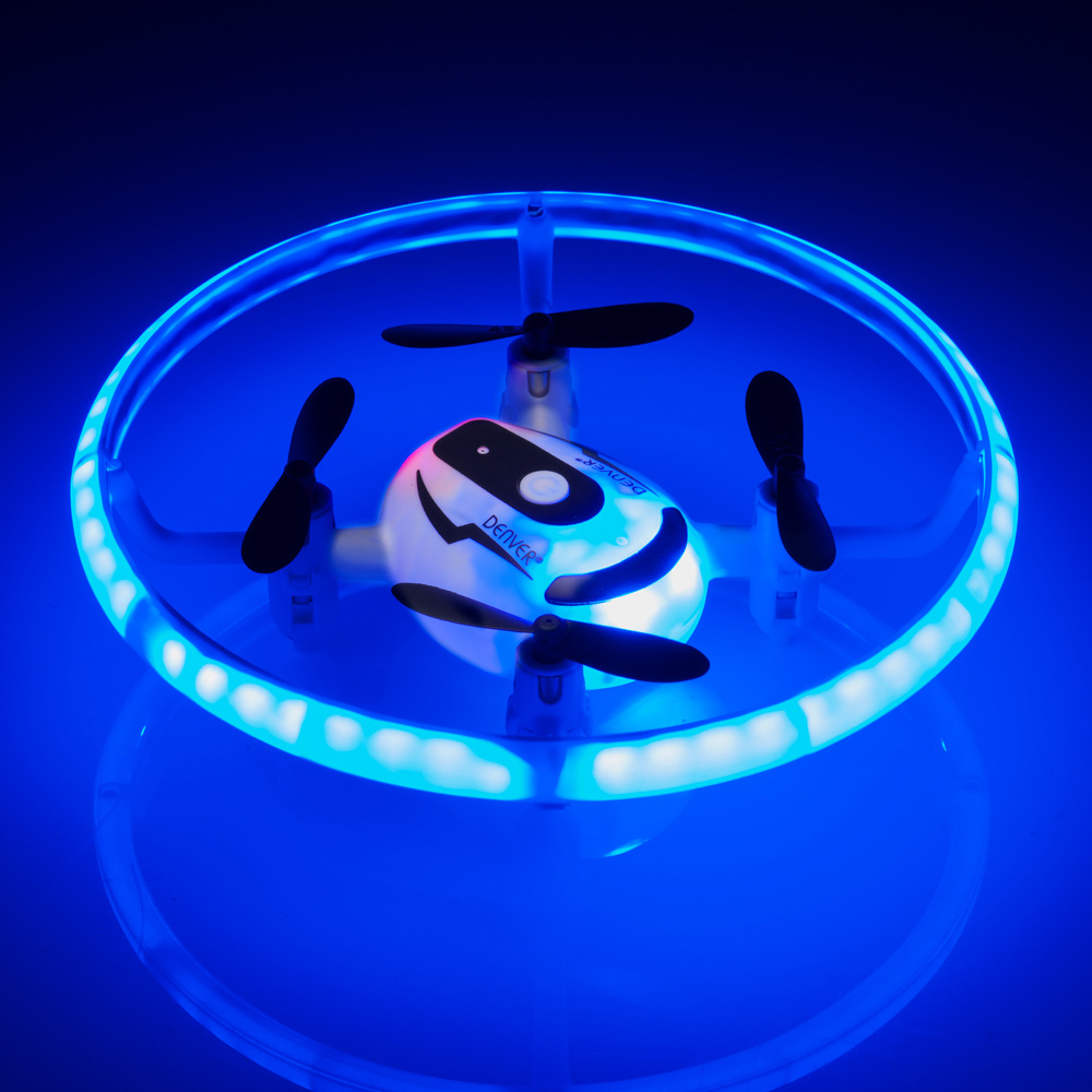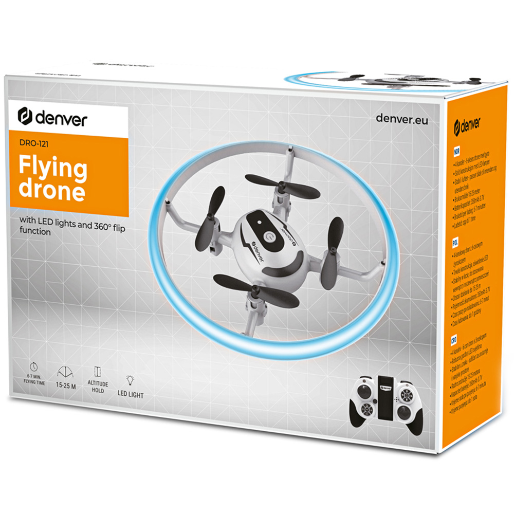 Experience the exhilaration of flying with the Denver DR0-121 Flying LED Drone. This advanced four-channel, six-axis drone with gyro function offers unparalleled stability, making it suitable for pilots of all experience levels. Whether you're flying indoors or outdoors, the drone's stability ensures a smooth and enjoyable flight experience. The drone is equipped with LED lights for captivating night flights and can soar up to 30 meters high. Its robust build and durable construction make it resilient, while the 350mAh battery provides six to seven minutes of non-stop fun on a single charge. With a quick charging time of around 50 minutes, you'll be back in the air in no time. The 2.4GHz controller ensures precise and responsive control, allowing you to unleash your inner pilot and explore the skies. Illuminate the night and experience endless airborne excitement. The controller requires three AAA batteries (not included).