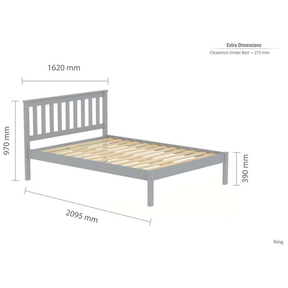 Exquisitely designed, the Denver King Size Grey Wooden Bed is crafted in a traditional shaker style to give a great heritage feel. Crafted from solid pine, this bed frame is sturdy and durable enough for safe use. Also, the frame has a solid slatted base for firmer support, allowing air to circulate beneath the mattress. Plus, it makes a perfect addition to your children's bedroom. Please note: beds are only suitable for a UK standard-size mattress.