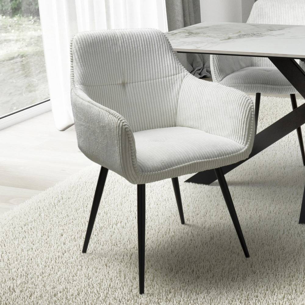 Featuring an enticing curved design, this dining chair combines smooth modernist lines with tactile soft corduroy fabric. The generously sloping bucket seat and high armrests provide incredible comfort. The chair backrest is attractively pleated, with matching piped edges. Complete with black metal cross-frame legs. Some assembly required.