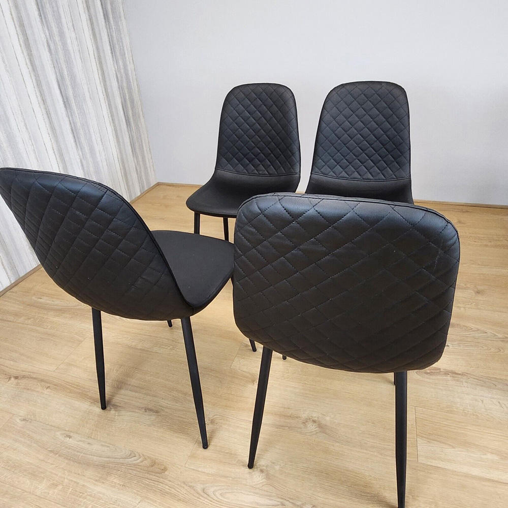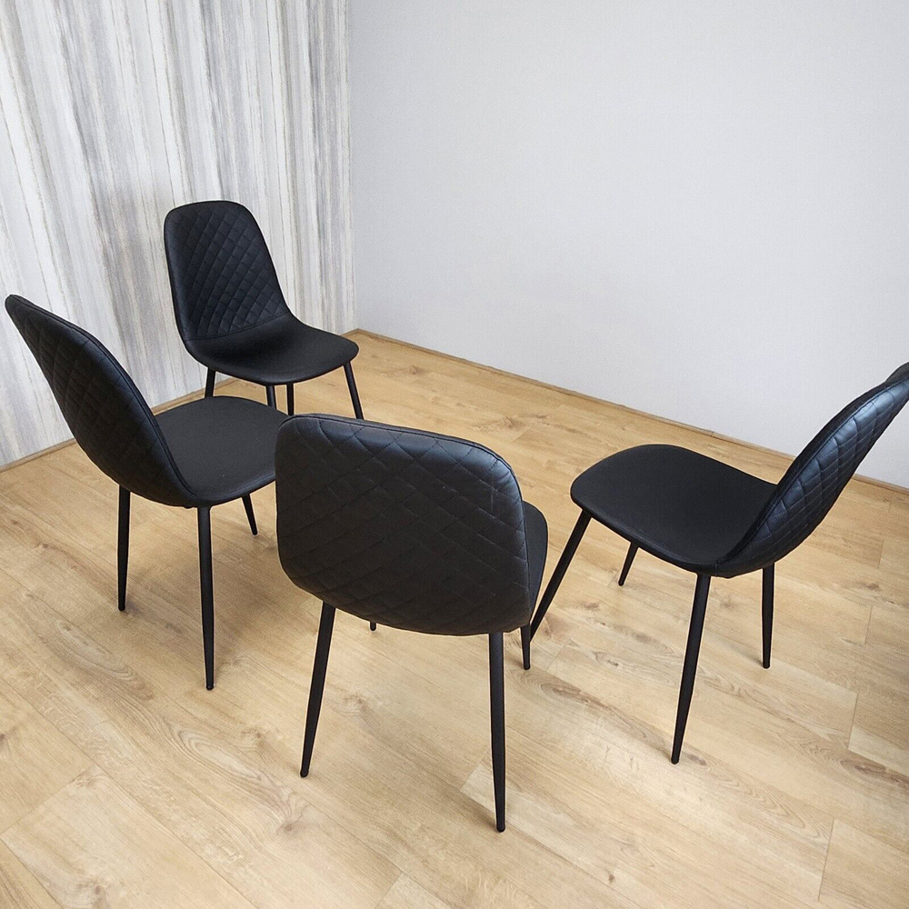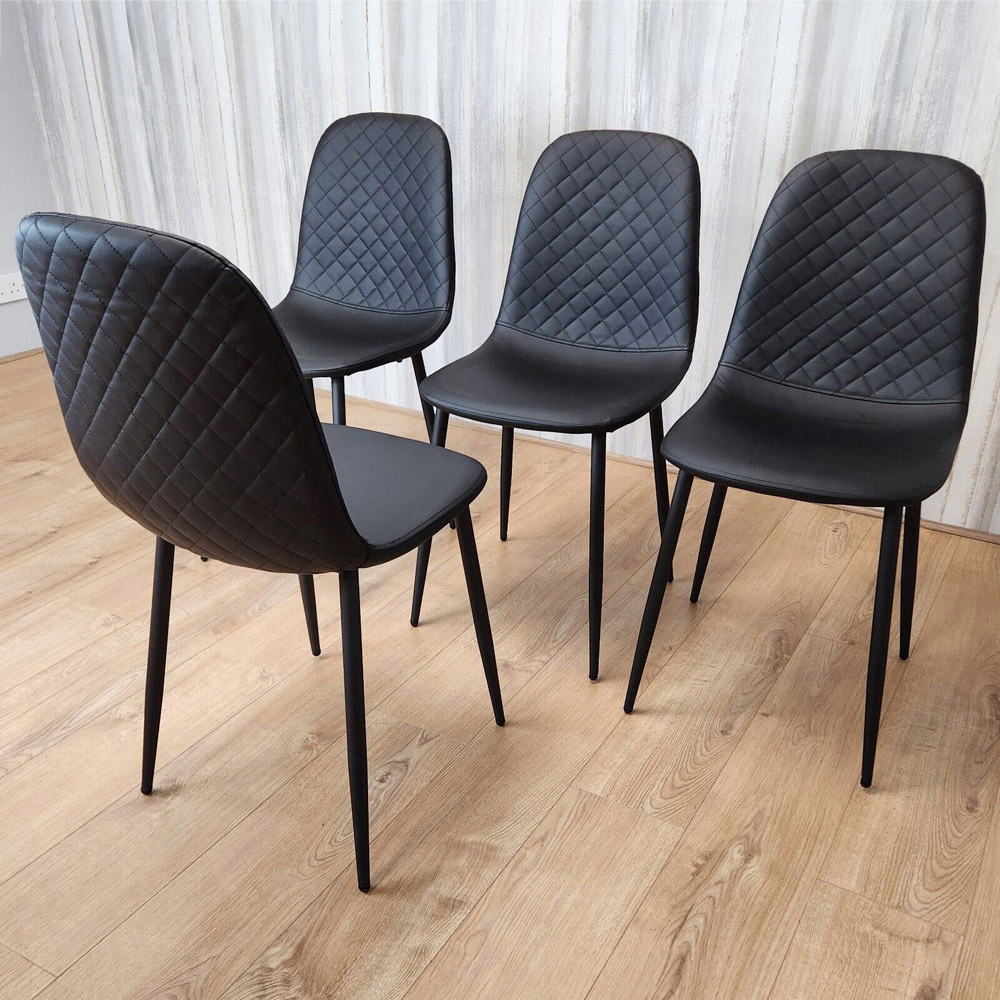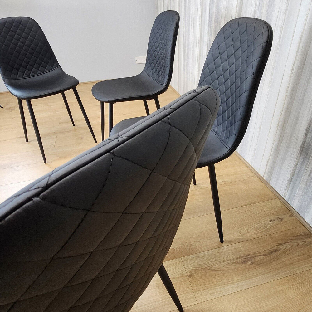 Rejuvenate your dining space with the Denver Black Leather Dining Chairs Set. This cosy set of four chairs will be a great addition to your dining room or kitchen. These chairs feature an intricate diamond-stitched pattern on both the front and back with cushioned seats for extra comfort. The elegant black-colour leather upholstery enhances the subtle look and feel of any dining space. A notable feature of these chairs is the adjustable foot mechanism, artfully integrated to ensure a level seating experience on any surface.