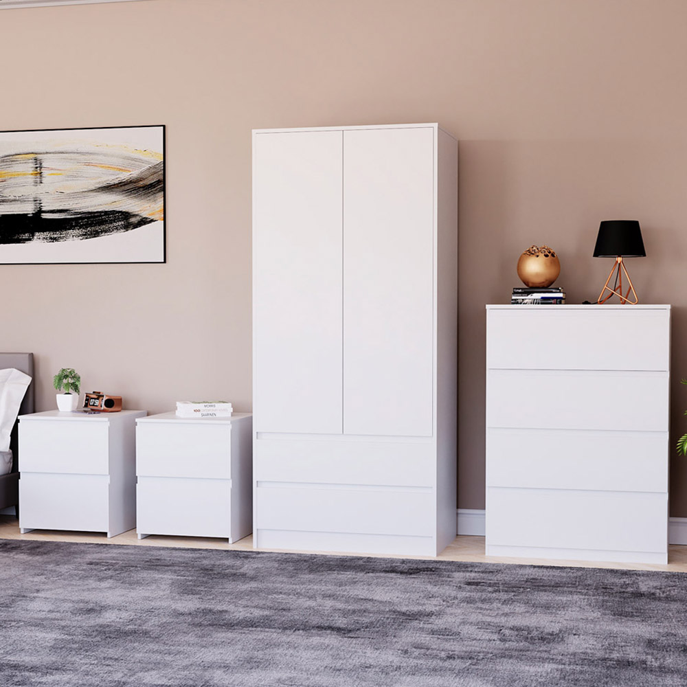 Create a fresh and organised bedroom retreat with a white 4 piece bedroom furniture set featuring drawers and wardrobe, perfectly suited for modern UK homes. Clean lines and a crisp finish ensure each large bedside chest and wardrobe set for bedrooms blends seamlessly, while the four-drawer chest and two-door wardrobe furniture package offers ample storage for clothes, accessories and essentials. Easy-to-follow assembly instructions and robust materials mean you’ll enjoy a harmonious and clutter-free space in no time.