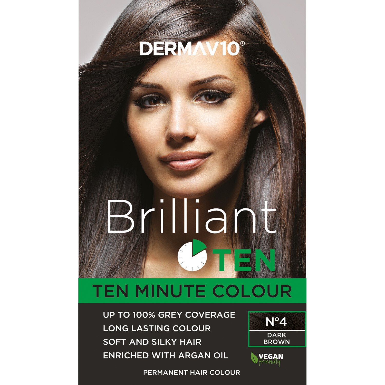 Derma V10 Brilliant Ten Permanent Hair Colour is a quick way to refresh and dye your hair! This 10-minute hair dye works fast, giving you up to 100% grey coverage and long-lasting colour. The hair colour is vegan-friendly and enriched with Argan Oil, which leaves your hair feeling soft and silky.