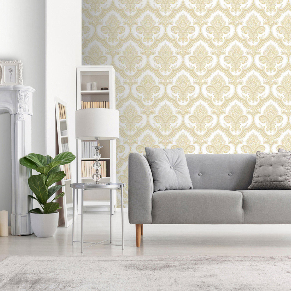 Bring a touch of regal charm to your walls with the DID Damask Gold Wallpaper. This luxurious wallpaper with its golden damask motif instantly transforms a room, adding warmth and sophistication. Designed with extra washable vinyl, it is suitable for high-traffic areas. The straight pattern repeat ensures a seamless look, making it perfect for feature walls in lounges and dining areas.