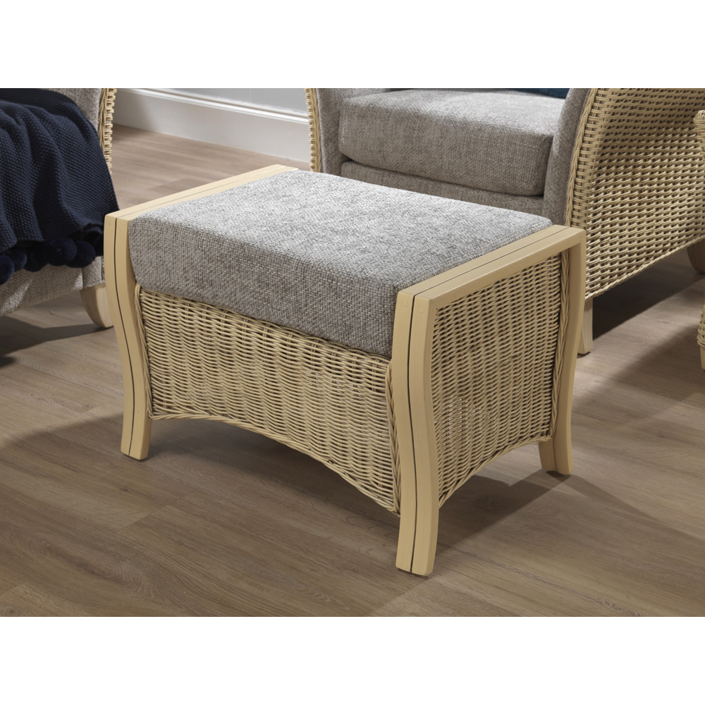 Add a timeless piece to your space with the Desser Arlington Grey Natural Rattan Footstool. This footstool is a seamless blend of modern and traditional design. Specifically created to complement both a living room and a conservatory or summerhouse, this footstool is meticulously crafted to perfectly align with the matching sofa and armchair. It features a concealed storage compartment beneath the cushion, ideal for storing small items. Moreover, the removable cushion cover, made from our Jubilee Grey fabric (100% polyester), can be easily washed at low temperatures. This footstool boasts a hand-crafted natural rattan frame, UK hand-sewn cushions, and a hidden storage compartment.
