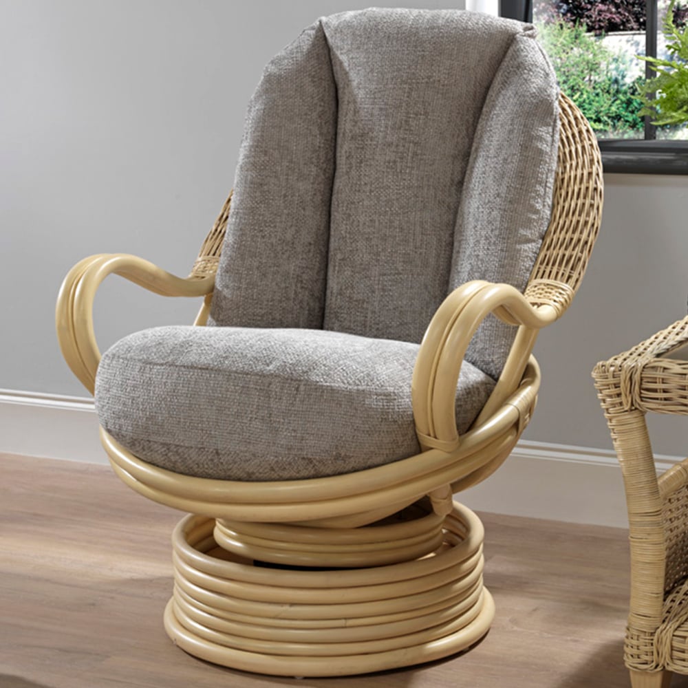 Enhance your seating experience with this elegant Desser Arlington Grey Fabric Natural Rattan Deluxe Swivel Rocker Chair. This chair is ideal for unwinding, featuring a 360-degree swivel and rocking motion, along with a charming wicker weave wrapping around the back of the frame. Crafted in the UK, the cushion is constructed from Quallofil, a premium filling with fibre fusion technology that ensures your cushions retain their shape for years to come. Moreover, the cushion covers, made from our jubilee grey fabric (100% polyester), can be easily removed for washing at low temperatures, while Dacron warp is incorporated to prevent signs of wear.