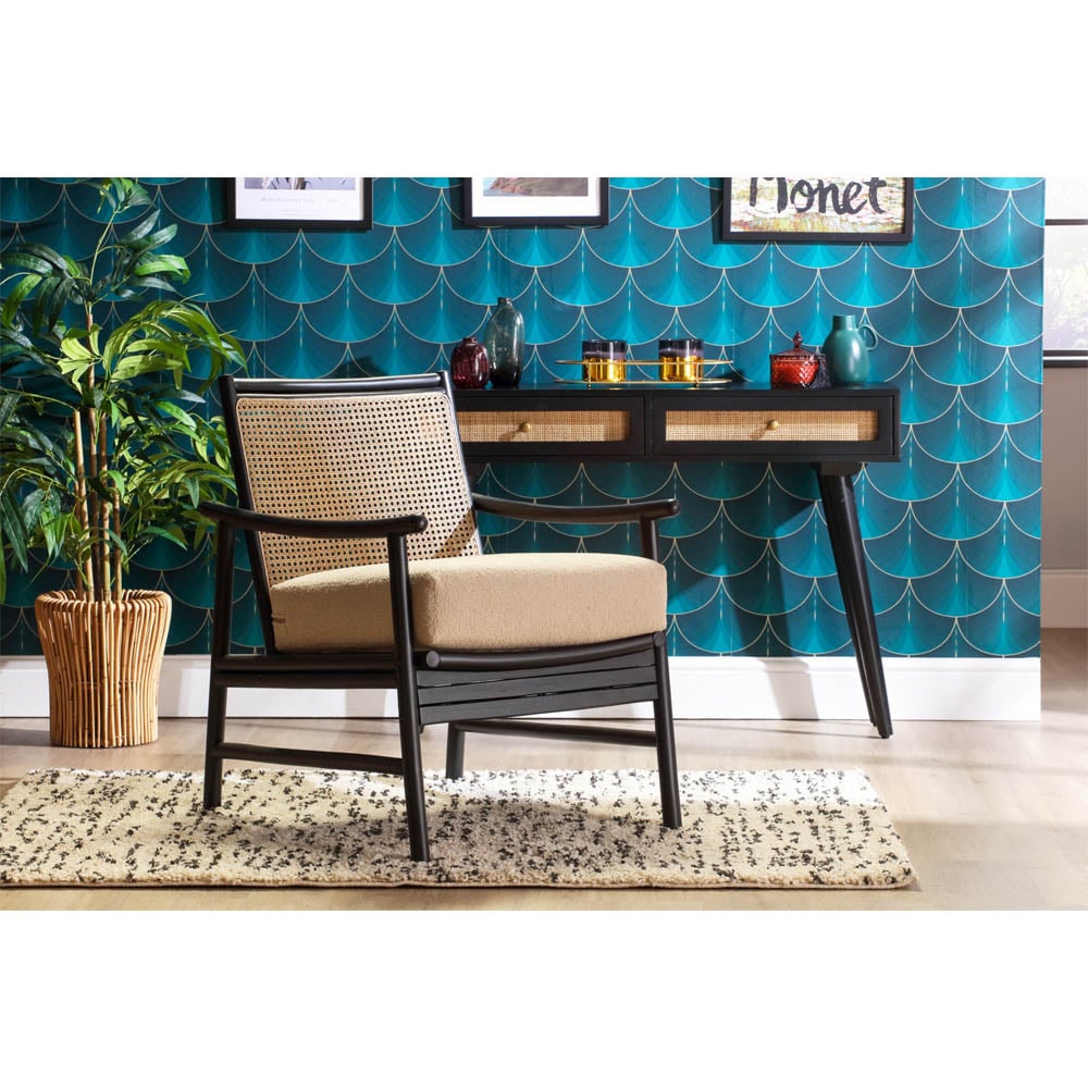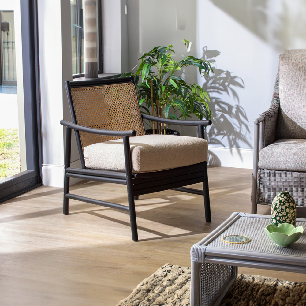 The Desser Borneo Black Indoor Chair is a meticulously crafted piece made from 100% natural rattan. Its design features elegant laminated arms and cane mesh webbing, giving it a contemporary and stylish look that can complement any room in your home. The chair's cane pole frame and deep, comfortable seat, along with the high-quality foam cushion, ensure its durability and provide a perfect spot for relaxation and reading. Moreover, the fabric is wrapped with Dacron to minimise wear and tear, ensuring that this furniture will last for a long time. With its double frame design, this chair offers exceptional strength and durability. The soft textured boucle cushion is hand-sewn in the UK, adding a touch of luxury to this already exquisite piece. Assembling this chair is also a breeze, making it a convenient addition to your home.