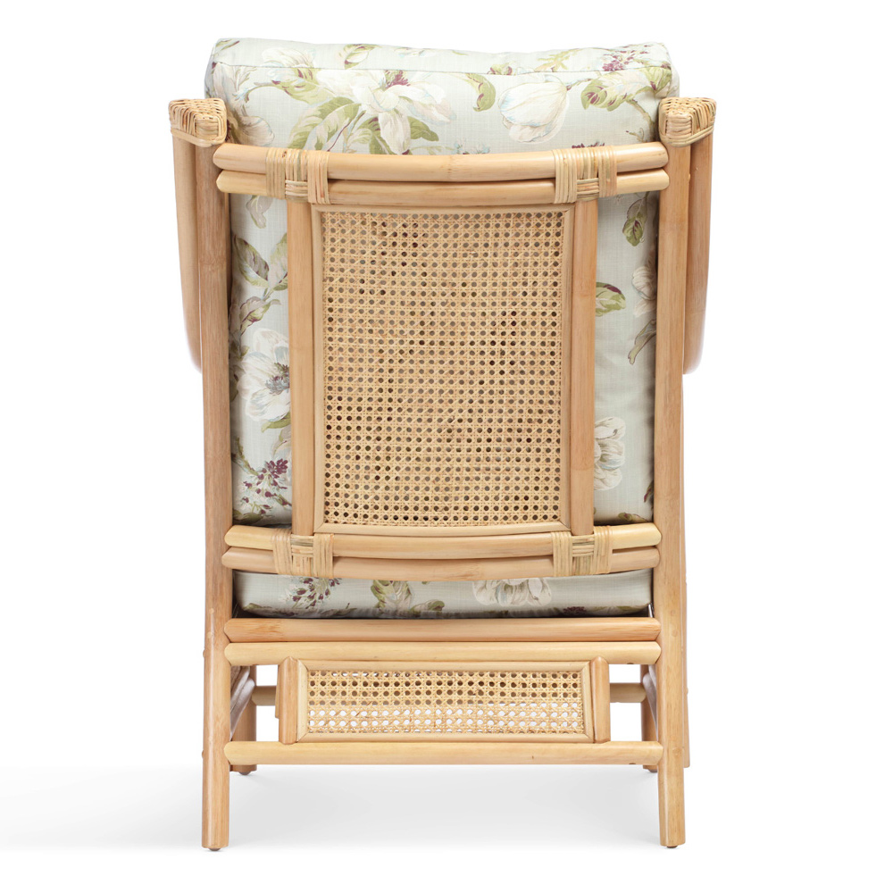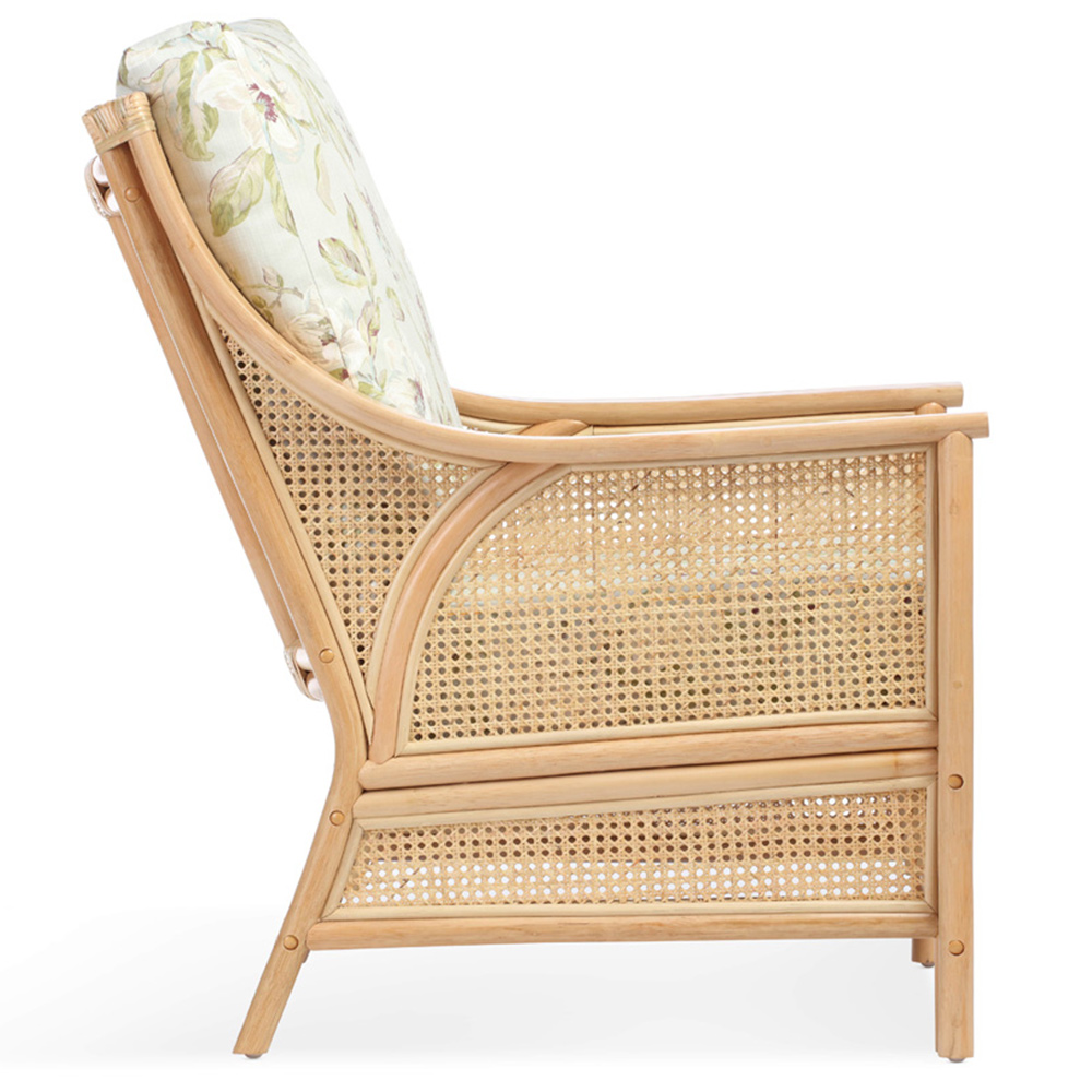 Add a contemporary touch to your dome decor with the Desser Chester Natural Floral Rattan Armchair. It features open cane mesh sides, back, and skirting, adding to its aesthetic appeal and stability. This armchair provides ample seating space for a single person, allowing you to relax in style. The UK hand-sewn cushions, made from floral lily fabric (100 per cent cotton), are reversible to ensure longevity and Dacron warp is used to prevent any signs of wear. Moreover, the cushions are designed with a foam-filled seat cushion and a supportive fibre-filled back. The covers are also removable for easy dry cleaning. The frame of the chair is hand-crafted using natural rattan, adding to its unique charm.