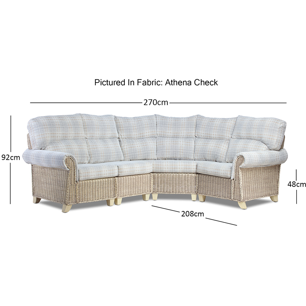 Enhance the look of any conservatory or living room with the Desser Clifton 5 Seater Natural Check Rattan Corner Sofa Set. Made with a natural rattan frame, this corner sofa features a curved back, making it a perfect fit for a rounded conservatory. The thick cushions provide a luxurious seating experience, and the arms are wrapped for added comfort. The cushions are attached with hook and loop fastener, allowing for easy removal and washing. The UK hand-sewn cushions, made with Athena check fabric (83% Polyester, 17% Viscose), are reversible, and the use of Dacron warp prevents worn areas from appearing. The seat cushion is filled with foam for optimal comfort, while the back is filled with supportive fibre. The covers are also removable for convenient dry cleaning.