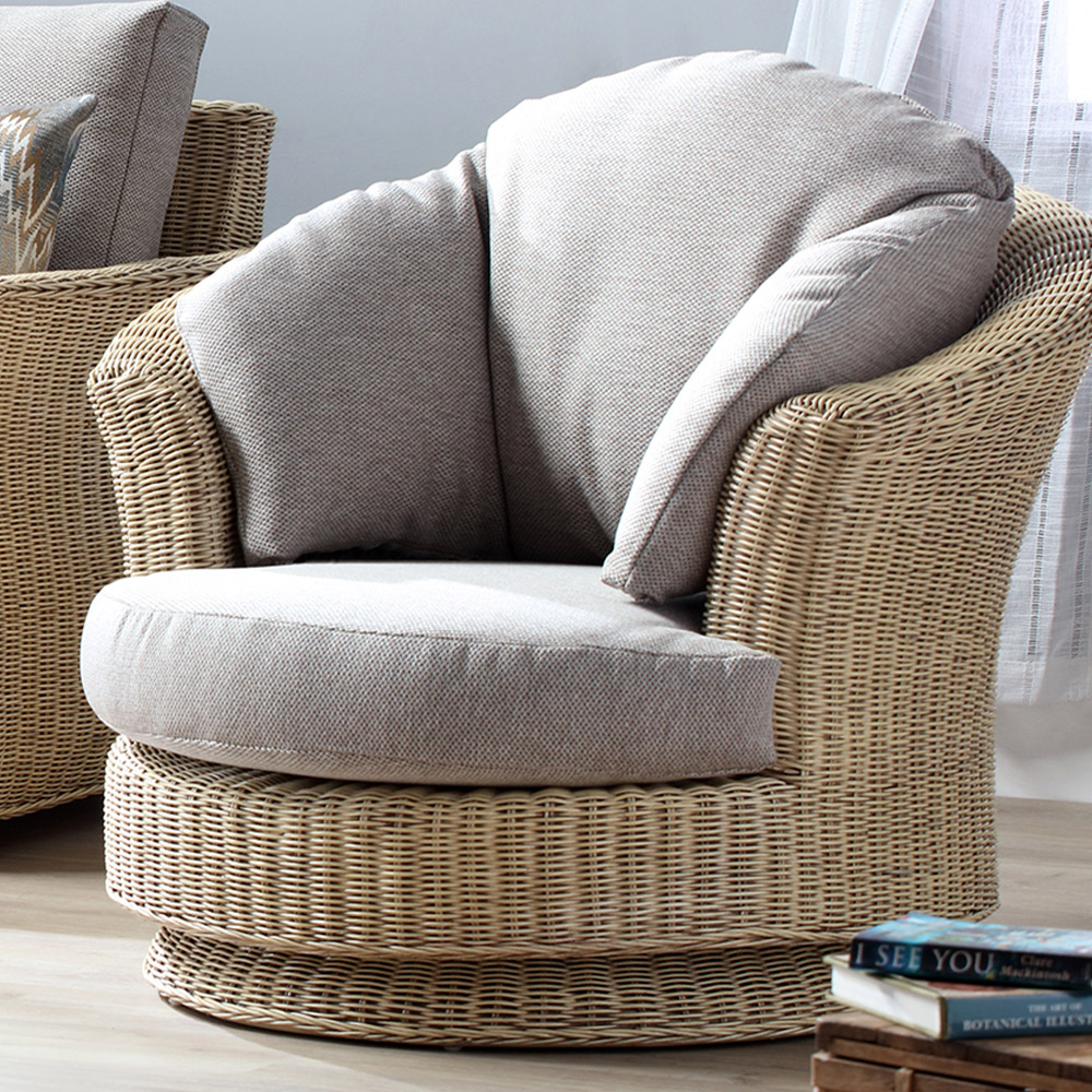 Introducing the Desser Corsica Natural Rattan Lyon Biscuit Swivel Chair, a meticulously handcrafted cane chair that offers a 360 degree rotation for your convenience. Its circular design and sturdy base provide both comfort and stability. With its boxy shape and stylish wicker weave, this swivel chair is a great space-saving option compared to our alternative Lyon swivel chair. Made in the UK, features biscuit fabric which is 100% polyester. They are reversible and designed with Dacron warp to prevent any signs of wear. The seat cushion is filled with foam for optimal comfort, while the back is filled with supportive fibre. The cushion covers are also removable, allowing for easy washing at low temperatures. The cushions are also hand-sewn in the UK, adding to the attention to detail.