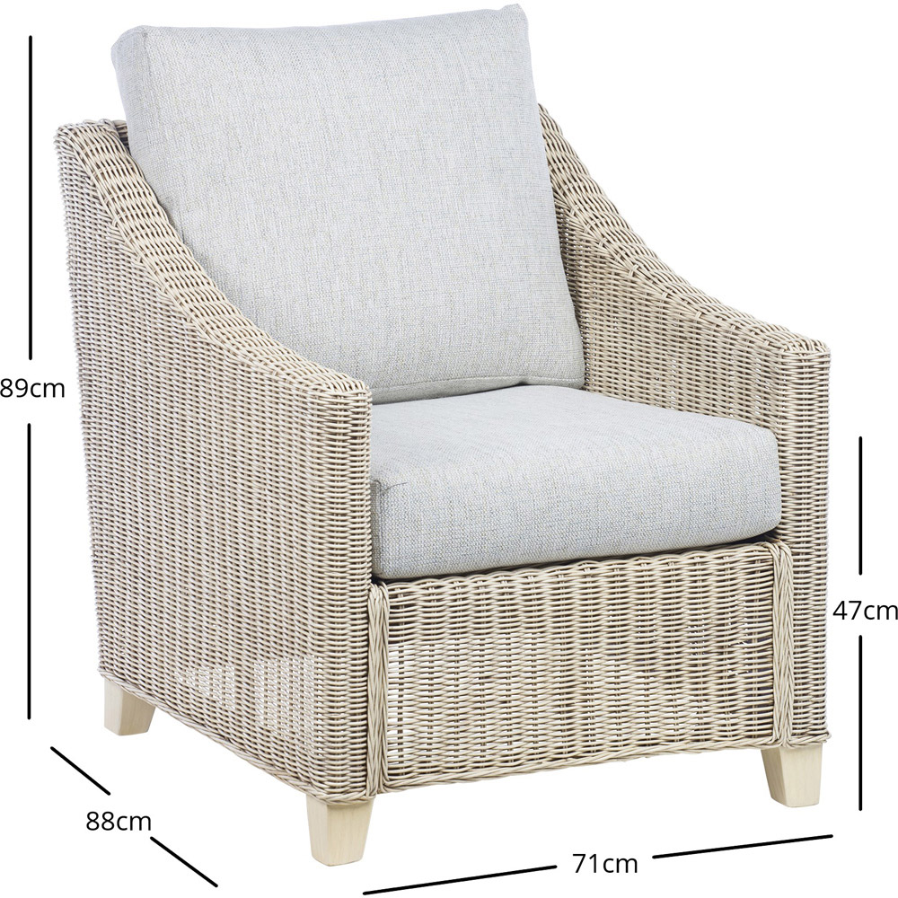 Make a stylish and practical addition to your living space with the Desser Dijon Armchair. With its minimalist design and understated charm, it effortlessly combines sweeping arms and compact lines. The sturdy core rattan frame provides a solid foundation for this contemporary piece. The armchair allows you to relax and unwind with others. The lower back design ensures maximum comfort as you sink into the plush seat. The cushions, made in the UK, feature our Pebble fabric which is 100 percent polyester. They are reversible and the use of Dacron warp prevents any signs of wear. The seat cushion is filled with foam for added support, while the back cushion is filled with supportive fibre. The covers are also removable, making them easy to wash up to 30 degrees Celsius.