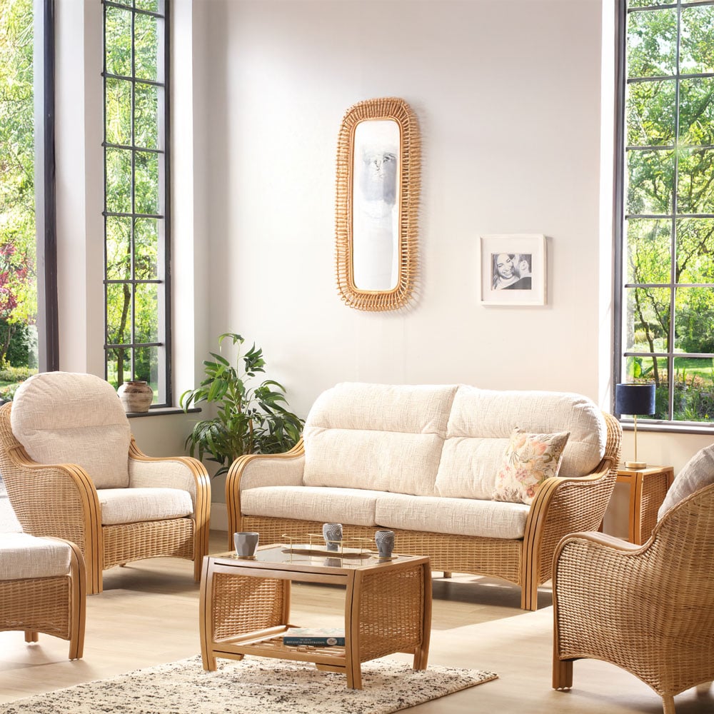 Crafted from classic core rattan, this wicker range offers a sleek and sturdy foundation, making it an ideal addition to any modern living space. Its light oak wash colour complements a variety of interior styles, enhancing both comfort and aesthetic appeal. Key features include hand-sewn cushions in the UK, supportive fibre-filled back cushions, comfortable foam-filled seat cushions, Dacron wrap protection, Pirelli webbing frame and sustainable craftsmanship.