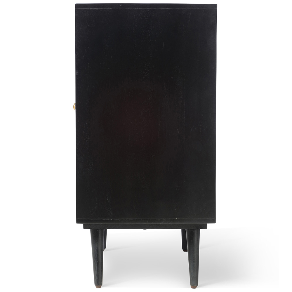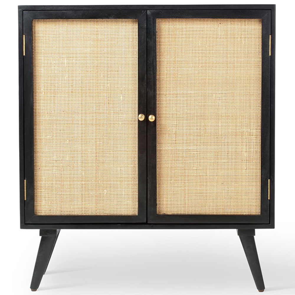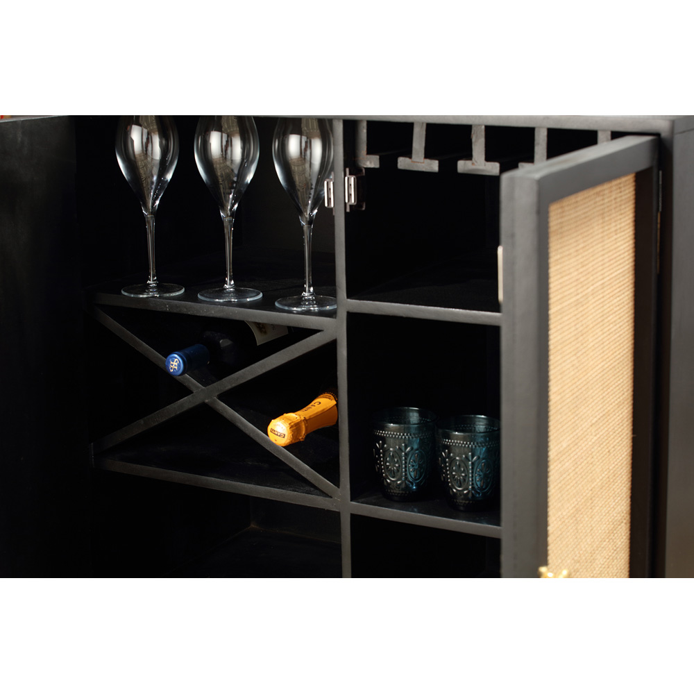 Make a classy addition to your home with the Desser Manhattan Tall Wine Cabinet. This black cabinet is a taller option with its unique wine and wine glass storage compartments. It is crafted using solid mango wood with natural rattan front panels, which have sustainable properties and gold-handle detailing. The distinctive texture of mango wood certainly makes this cabinet unique and elegant. It features a two-door design with compartments that are perfect for storing wine glasses, bottles and bar accessories. This sideboard is perfect for the hallway, entryway, living area, kitchen or dining room and will enrich your home decor.