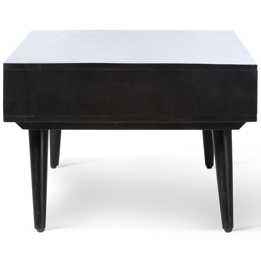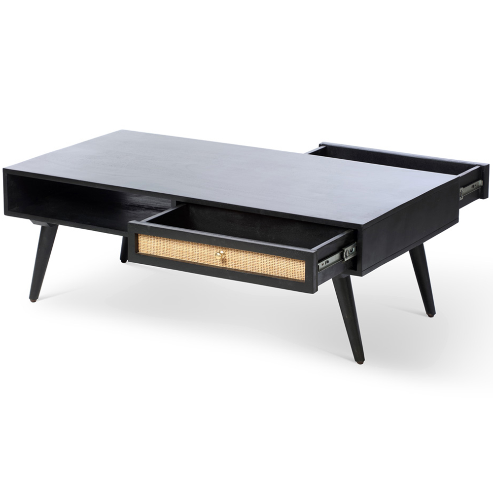 Make a classic addition to your home with the Desser Manhattan Coffee Table. All you need to do is sit back and enjoy this amazing coffee table. Enjoy big moments on television with this wide TV unit. Featuring two natural rattan front panel drawers, gold handle detailing and an open shelf below the smooth top, this coffee table will surely complement the interiors of your living room. This black colour coffee table is a great piece of furniture for display and storage purposes. It is handcrafted using solid mango wood, which has sustainable properties, and its distinctive texture will certainly make it unique and elegant.