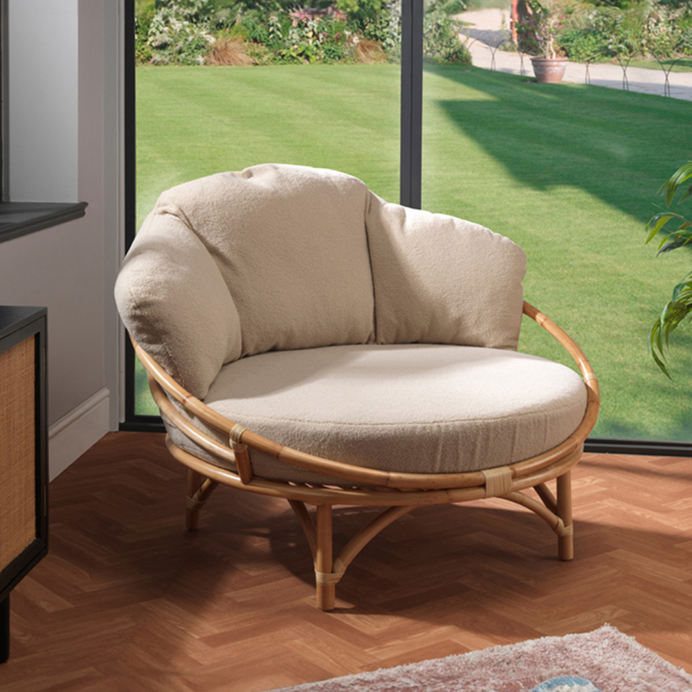 The Desser Snug Cuddle Rattan Chair with Boucle Latte Cushion is an exceptional piece of furniture that provides the ultimate comfort and relaxation. This indoor snug chair is expertly crafted with a sturdy fixed rattan base, ensuring durability and stability. Its circular design not only adds to its aesthetic appeal but also enhances its stability. The hand-sewn cushion, made from soft textured boucle fabric, offers supreme comfort and is meticulously crafted in the UK. With its spacious design, this chair can accommodate one or two people, making it perfect for both individual use and sharing. The addition of Dacron wrapping ensures that this chair will last for a long time, providing you with endless hours of relaxation.