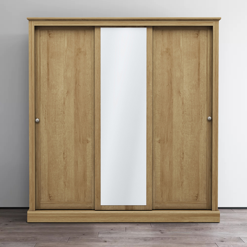 Organise your bedrooms with this Devon 3-door Oak Effect Sliding Wardrobe. This bedroom range offers a traditional design - perfect for all decor styles. Featuring three sliding doors with two plain and one mirrored side, this wardrobe is an ideal solution for your bedroom space. The wardrobe is available in three stunning finishes, including oak and white, oak and charcoal and oak. Also, the wardrobe offers a timeless elegance to any home with convenience.