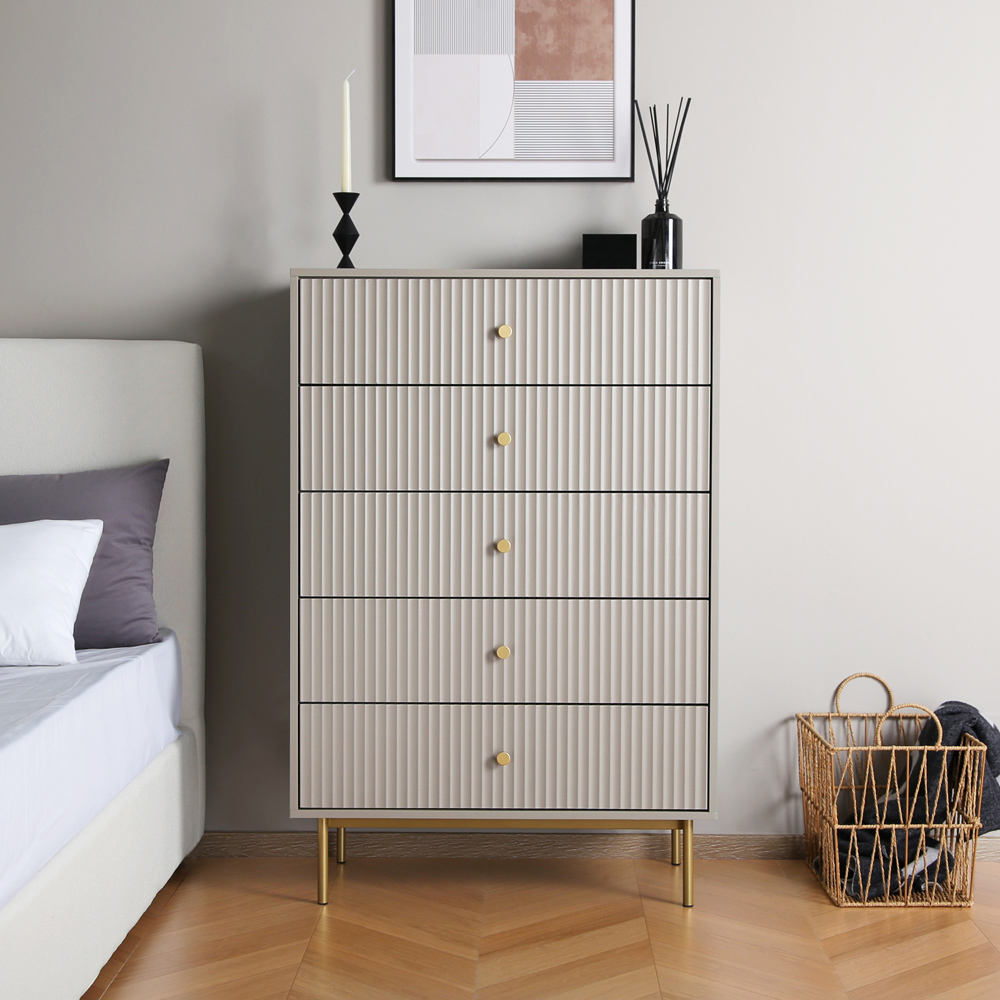 The Devon chest of five drawers is an elegant and practical piece designed to enhance bedroom storage. This large chest of drawers is crafted from a sturdy MDF frame, finished with a matte PU paint. The wide chest of five drawers offers ample storage space, making it an ideal chest of drawers for bedroom settings. The metal handles and legs are coated with a durable powder finish, adding a touch of sophistication and ensuring the piece's longevity. This chest of five drawers combines functionality with aesthetic appeal, fitting seamlessly into various interior designs. The different colour options allow for customization to match any decor. Whether used for its practical storage capabilities or as a stylish accent, the Devon five drawers chest is a perfect blend of utility and timeless design, enhancing any bedroom's decor.