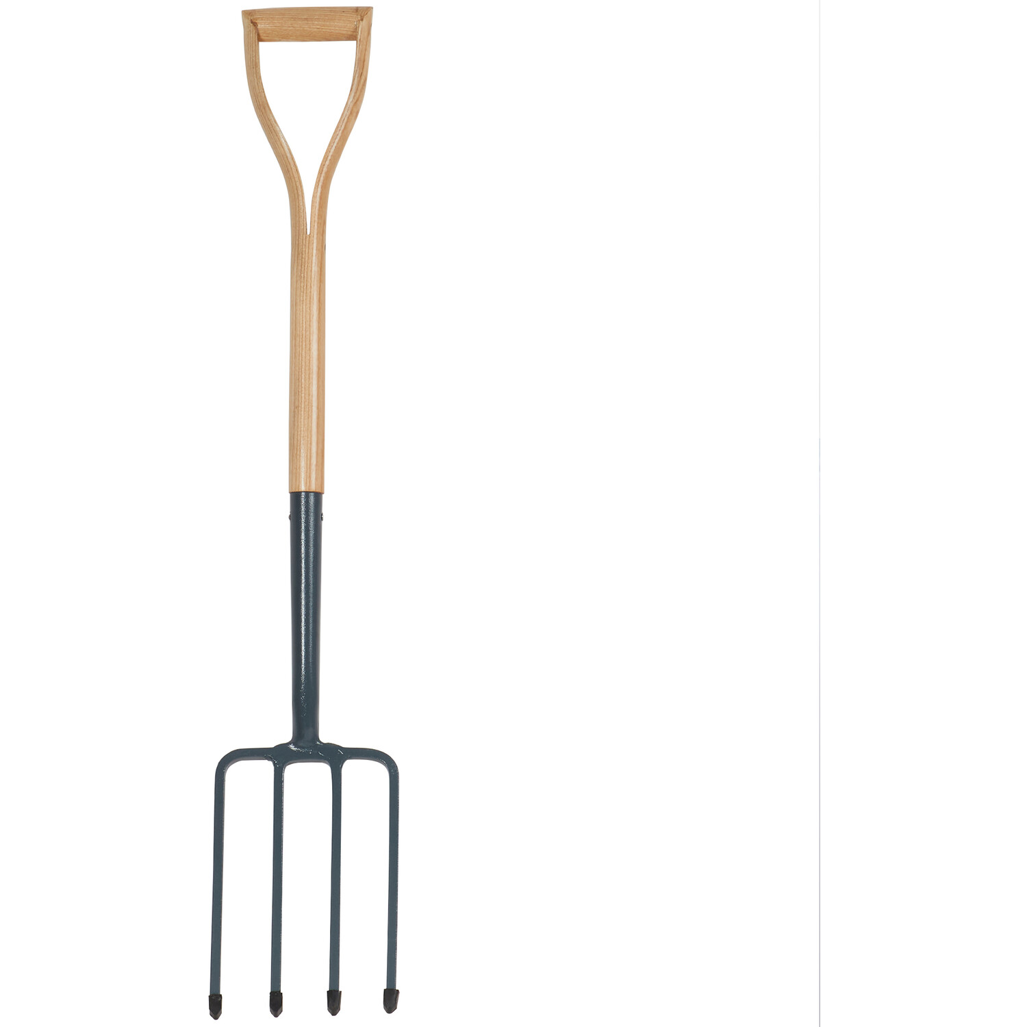 This Digging Fork with Ashwood Handle is a heavy-duty tool designed for durability and comfort. It is made from fully hardened, high-quality epoxy-coated carbon steel, ensuring that it will last for many years. The solid ash wood handle is also designed to absorb shocks, making it comfortable to use for extended periods of time. This makes it an excellent tool for digging up garden beds or breaking up hard soil. The fork's design allows for better leverage, making it easier to turn over soil and remove weeds.
