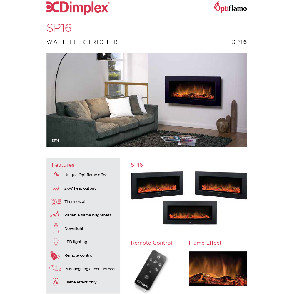 The stunning Dimplex SP16E LED Electric Fire features a wide flame picture, providing an impressive centre piece for your room. Dimplex Optiflame technology with LED lighting illuminates the log fuel bed to create a cosy flame effect that can be enjoyed with or without heat. The concealed heater has an output of 2kW, with choice of 2 heat settings: 1kW or 2kW , the variable thermostat allows you to adjust the temperature to suit your room. The SP16E also comes with a handy remote control to allow ease of use. This fire is designed for wall mounting or the chassis can be recess into the wall.