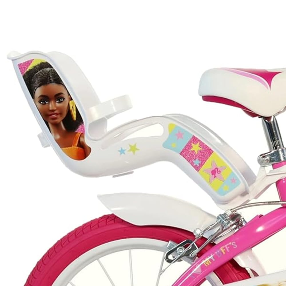 This Barbie licensed bicycle comes with front and rear calliper brakes, and a freewheeling rear wheel which offer optimum safety for young riders. It features pneumatic tyres with spoked 16-inch wheels and mudguards as well as removable stabilisers. This bicycle comes with an adjustable saddle and handlebars, a rear doll carrier with a strap and a front basket, which makes it suitable for ages between five to eight years. Suitable height range: 107-138cm.
