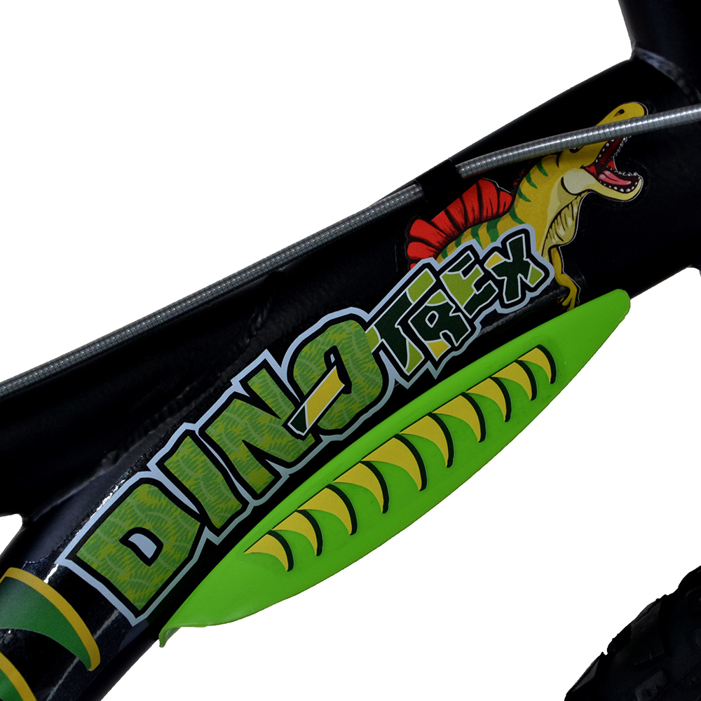 Featuring chunky, off-road style pneumatic tyres on 16” wheels, this freewheeling Dinosaur bicycle has front and rear calliper brakes, an ‘off-road’ style rear mudguard, a front mudguard with simulated dinosaur scales integrated into the frame, a large front shield, removable stabilisers, an adjustable saddle and handlebars and is finished off with cool Dinosaur decals. Suits ages 5 - 8 years. Child height range 107 - 138 cm.