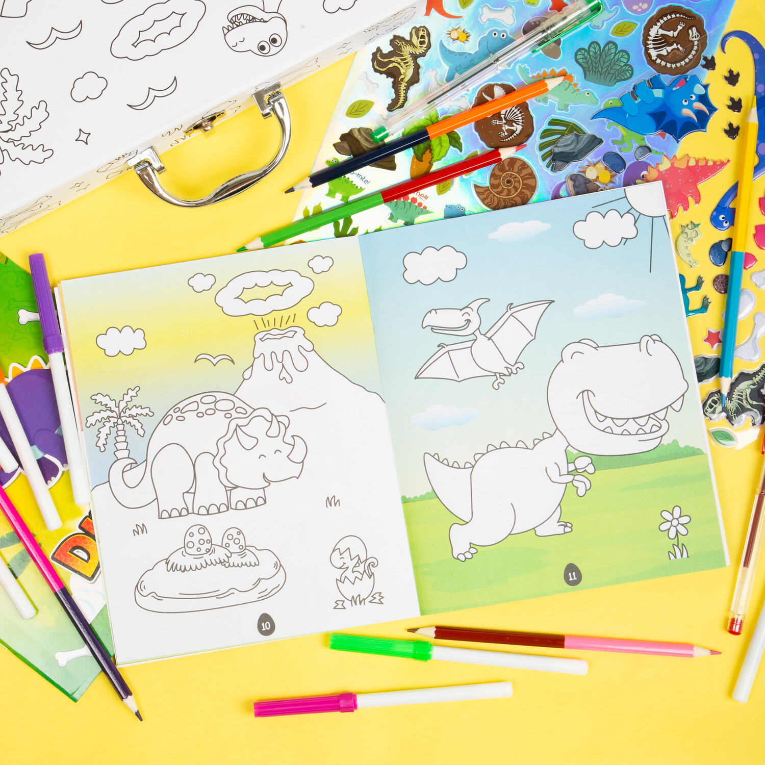 This Dino Colouring and Activity Case is a roar-some colour-in carry case for on-the-go creatives. With vibrant markers, gel pens and double-ended colouring pencils, you can bring life to cool pictures, complete fun activities and even colour in the case itself! There are even plenty of stickers for you to add to your designs.