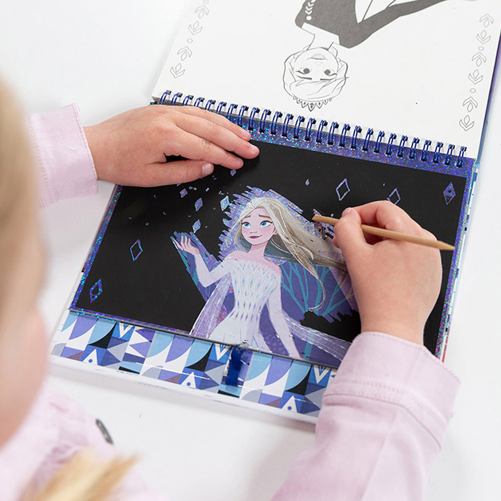 Dive into the magical world of frosty wonders with this Disney Frozen Scratch Pad. This fun scratch book contains 10 scratch cards and a scratch tool to make your imaginary world. The book also has 11 coloured pages (pens and pencils not included) with scenery and includes a sticker sheet and stencil for added fun. Reveal your favourite Frozen character with the scratch tool, use the stencil on the inner sheets to draw and then colour them in and decorate them with the included stickers. This product is Disney Frozen licensed and suitable for ages three and above.