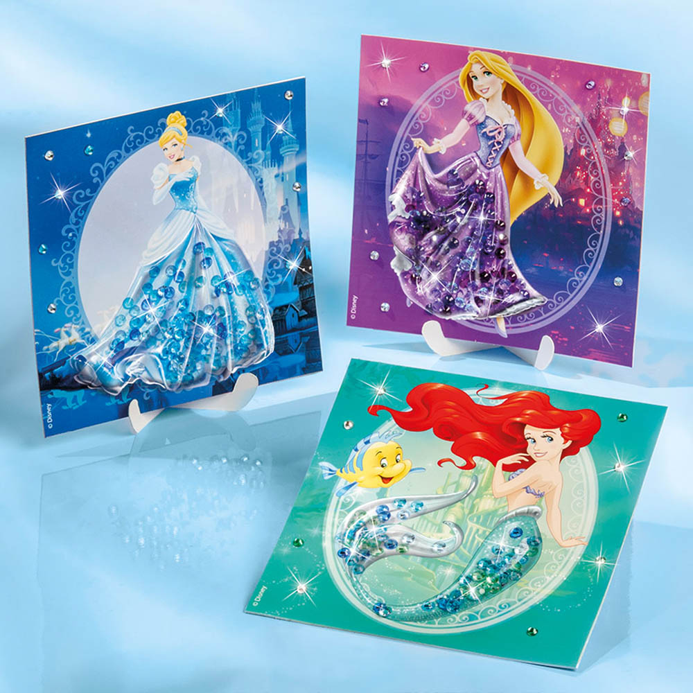 Dive into the magical world of creativity with these Disney Princess Glitter Shaker Cards. This set contains three brilliant shake cards with 3D dresses which you can fill with different coloured rhinestones. Once decorated, the cards can then be displayed on the included stands. This product is Disney Princess licensed and suitable for ages four and above.