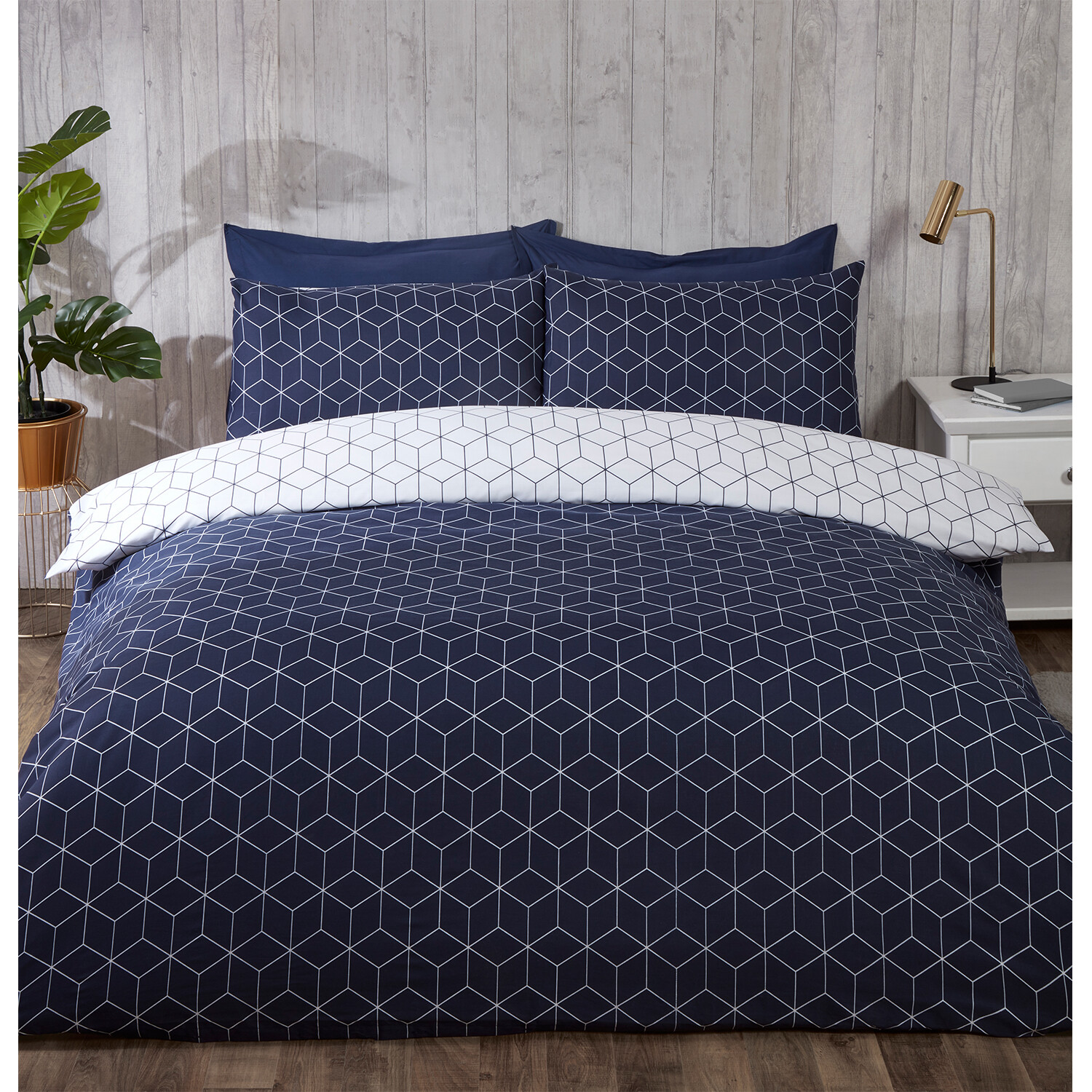 Give your bedroom an on-trend restyle with this Apollo Geo Duvet Cover and Pillowcase Set, displaying a modern geometric cube pattern in white atop a colourful base. The reverse of this stylish bedding set displays the same pattern printed in inverted colours and matching pillowcases help finish off the contemporary look.