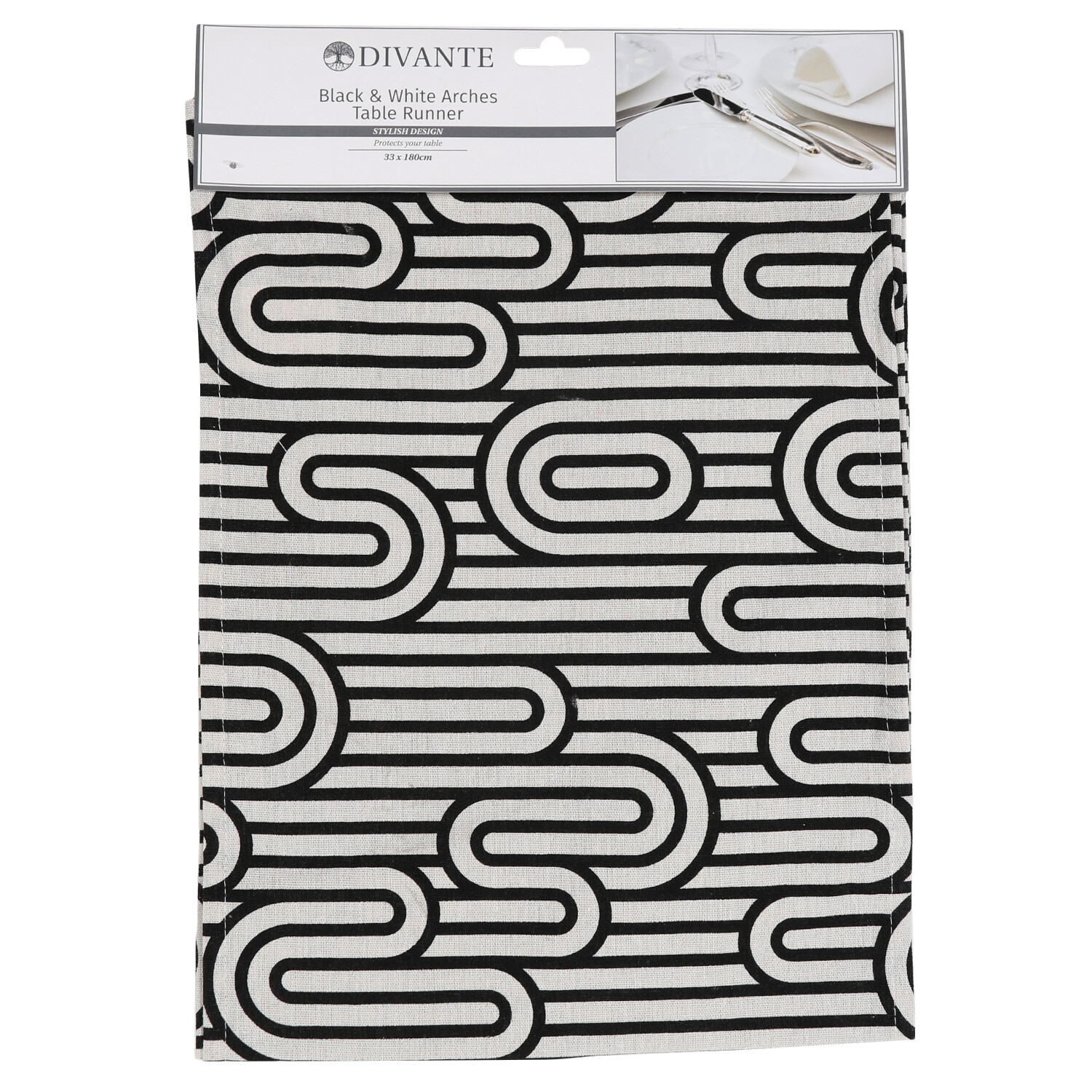 The Arches Table Runner is a brilliant way to dress your dining table in a modern fashion. The elegant and stylish runner features a contemporary arch design in monochrome tones of black and white for a dynamic and exciting look. Not only does the runner provide your dining area with a fashion-forward feel, but it also protects your table from water rings, spills, and everyday heat damage caused by plates. It's the perfect way to make any meal feel like a special occasion.